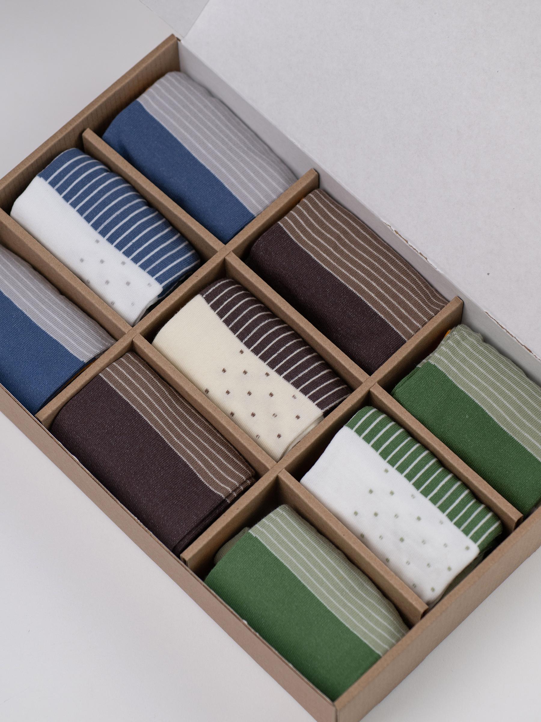 В этот набор входят 9 пар мужских носков в спокойных расцветках с классическими принтами, которые подойдут для любого повседневного образа.
