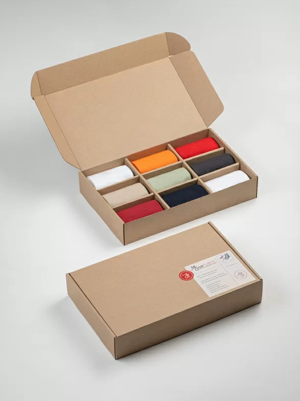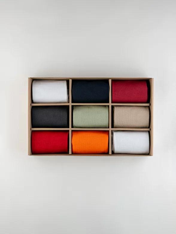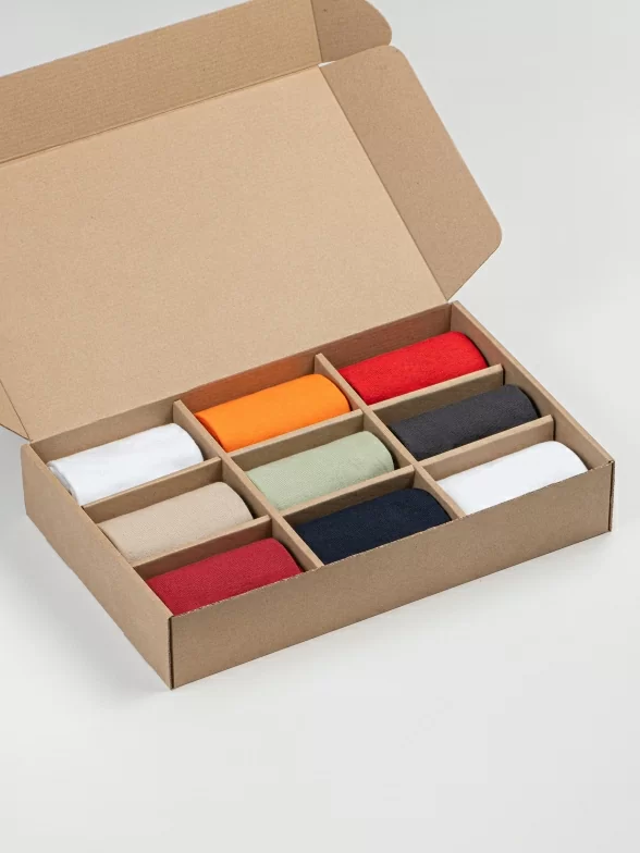 Носки компактно свернуты в аккуратные рулончики внутри стильной фирменной коробки. Для сохранности внешнего вида при транспортировке набор упаковывается в плотный картон.