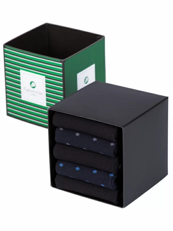 Набор состоит из 3 пар черных носков артикула 17D1 и 2 пар черных носков артикула 18D1, сложенных в фирменную коробку-кубик, которая дополнительно упакована в плотный транспортный картон для сохранности при доставке.