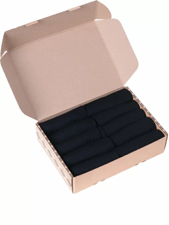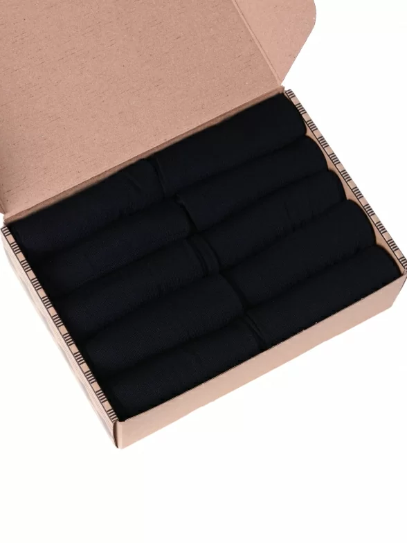 Набор состоит из 10 пар черных носков артикула 15D7, компактно свернутых рулончиками без фабричных этикеток в фирменной коробке, которая дополнительно упаковывается в плотный транспортный картон для сохранности при доставке.