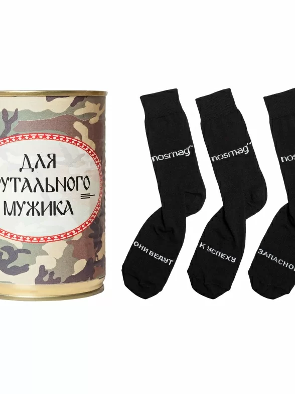 Носки всегда пригодятся настоящему мужику, брутальные - не исключение. А какая подарочная упаковка для носков самая брутальная? Может быть коробочка с бантиком? Смешно. Носки без упаковки - скучно. А вот консервная банка - самое то! Она выполнена в фирменном дизайне, а внутри находится целых три носка. Куда одевать третий, ведь это брутальный, а не радиоактивный мужик - скажете вы. Третий носок - запасной, о чем непосредственно свидетельствует надпись на нем, впрочем два других тоже оформлены надписями, но более приятными. А еще данные носки очень качественные, плотные и удобные, так что подарок точно придется по вкусу.
