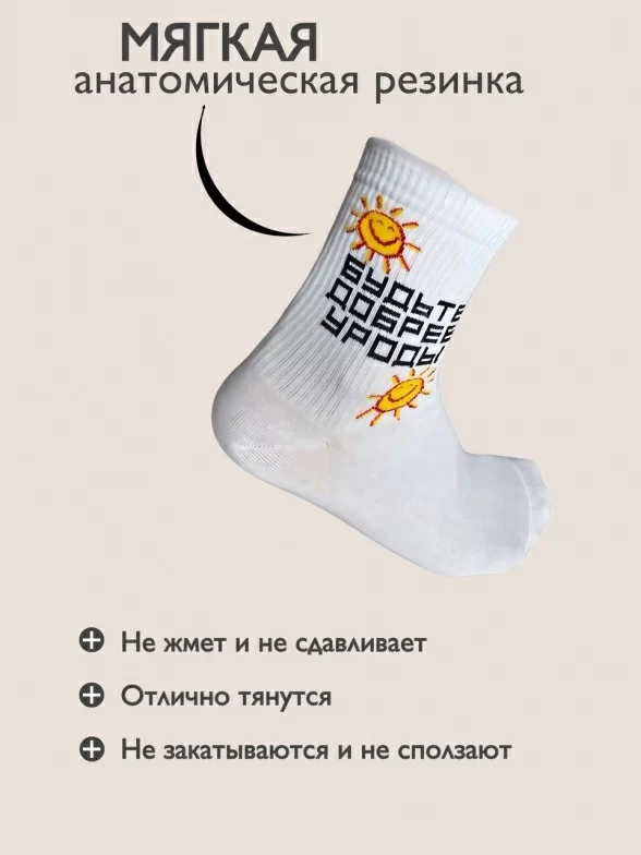 Круглогодичные средней длины носки унисекс, цвет белый, повседневные, шов обычный (не бесшовные), принт (рисунок): надписи, в рубчик, состав: 80% хлопок, 15% полиамид, 5% эластан, арт. Будьте добрее. Производитель «TIME FIRE» Россия под брендом «Time fire».