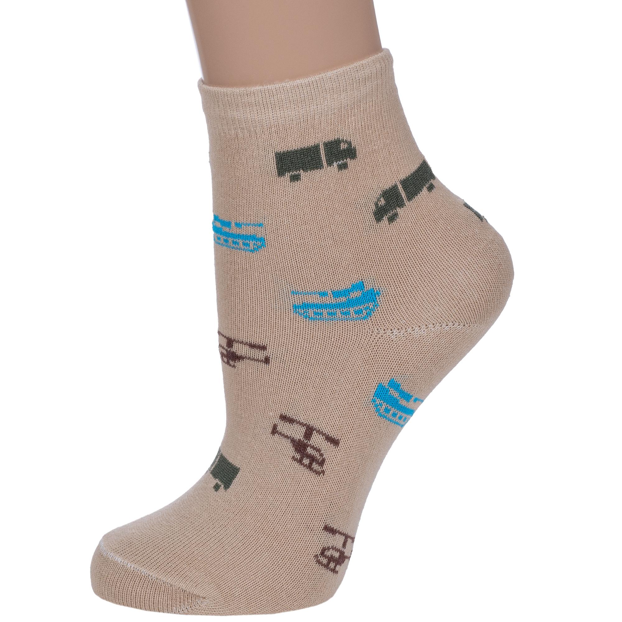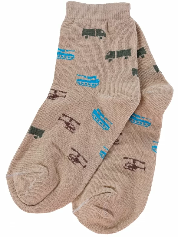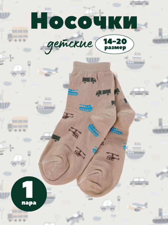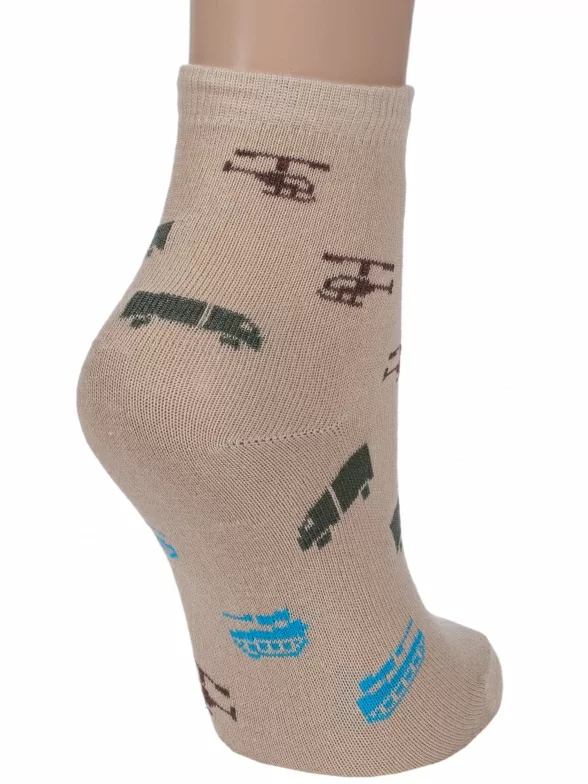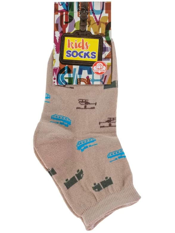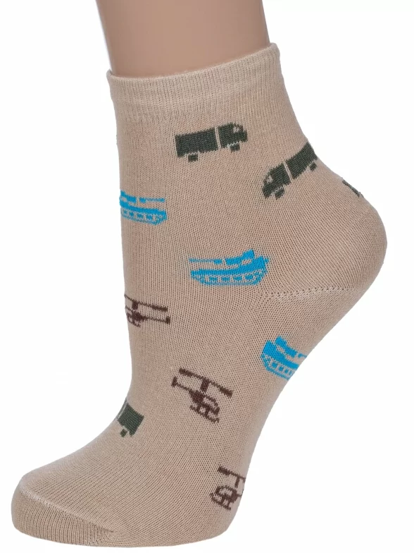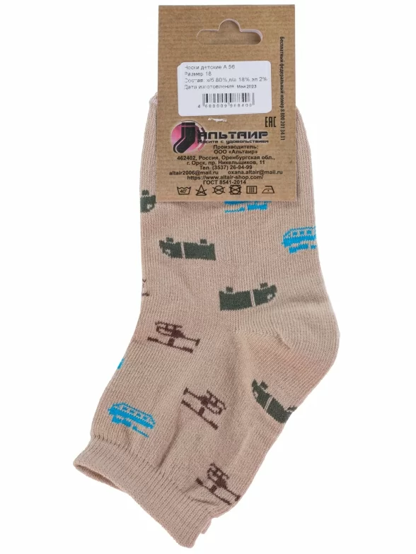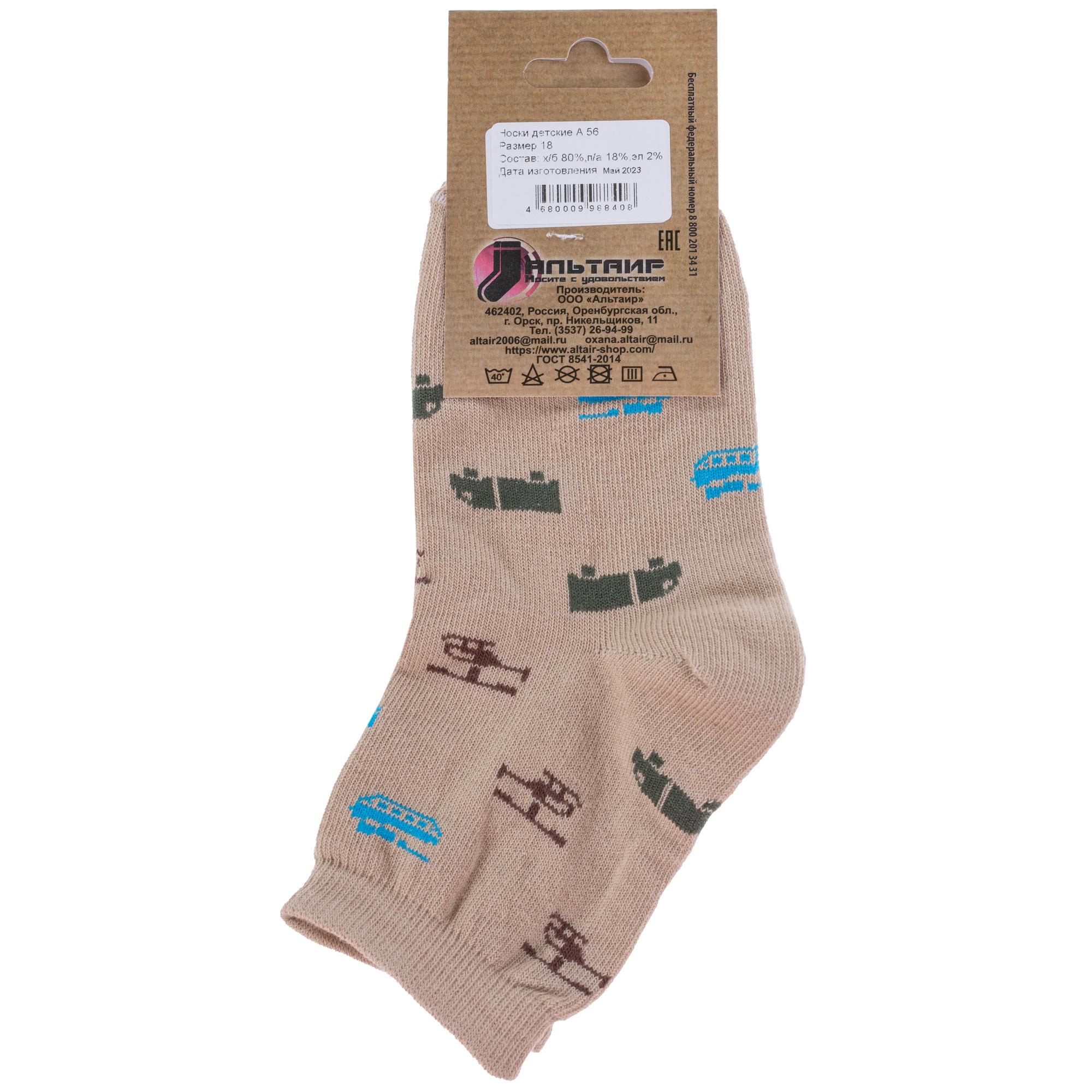 Круглогодичные укороченные детские носки, цвет бежевый, повседневные, шов обычный (не бесшовные), принт (рисунок): транспорт, с узором, состав: 80% хлопок, 18% полиамид, 2% эластан, арт. А56. Производитель «ООО Альтаир, г. Орск, Оренбургская обл, Россия» под брендом «Альтаир».