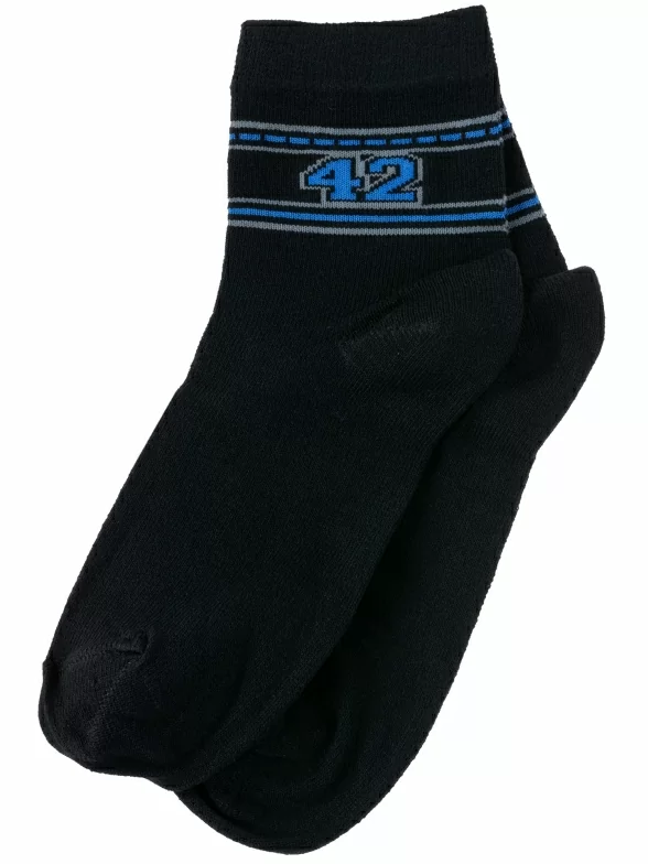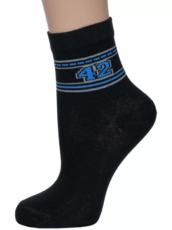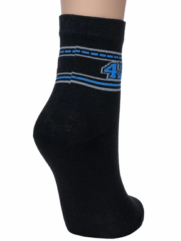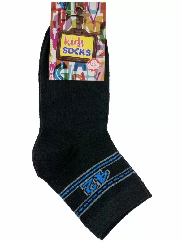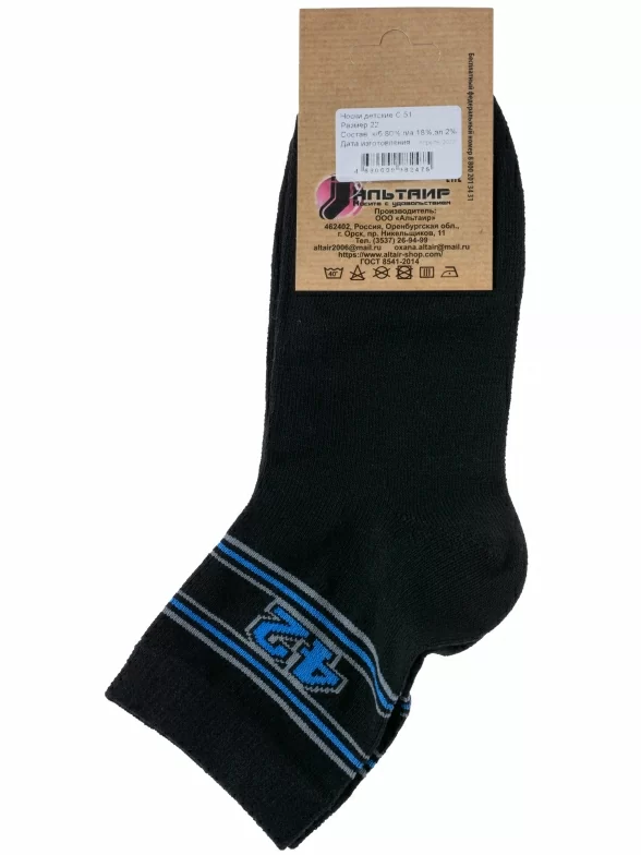 Круглогодичные укороченные детские носки, цвет черный, спортивные, классические, шов обычный (не бесшовные), принт (рисунок): спортивные, с узором, состав: 80% хлопок, 18% полиамид, 2% эластан, арт. С51. Производитель «ООО Альтаир, г. Орск, Оренбургская обл, Россия» под брендом «Альтаир».
