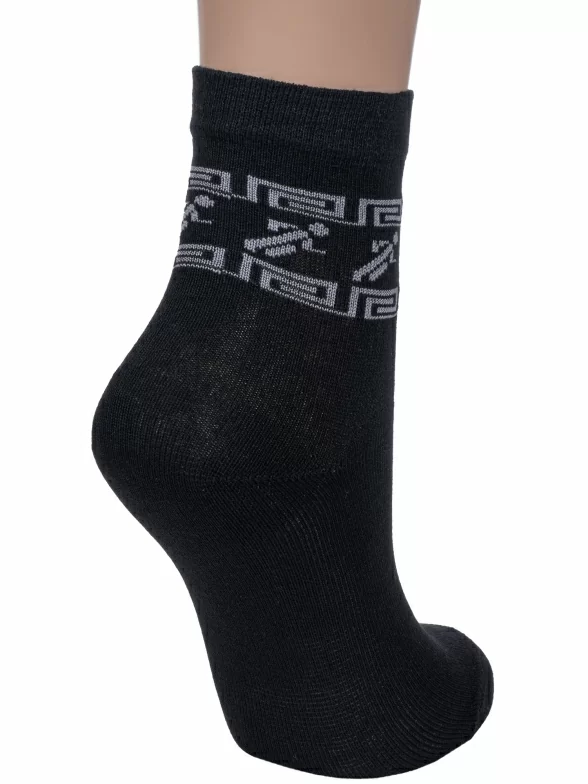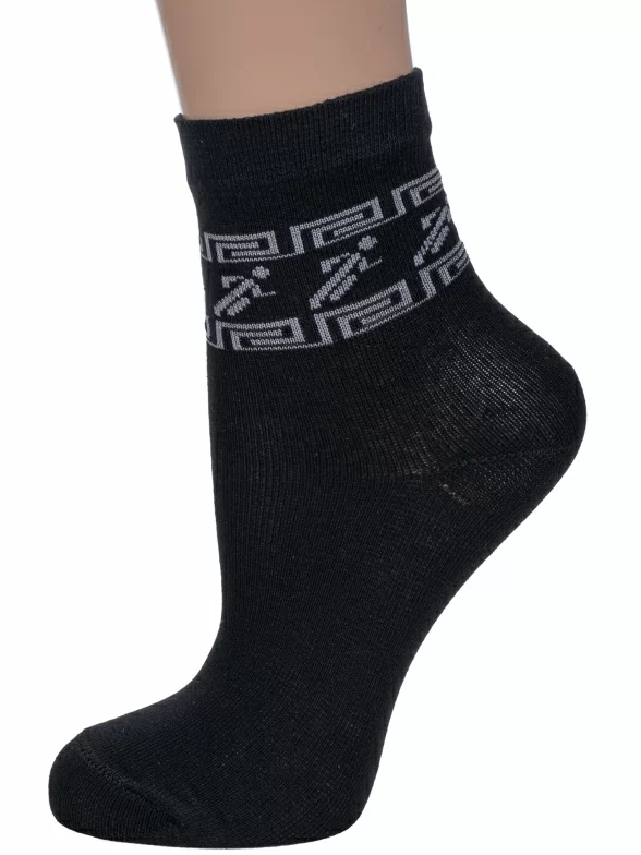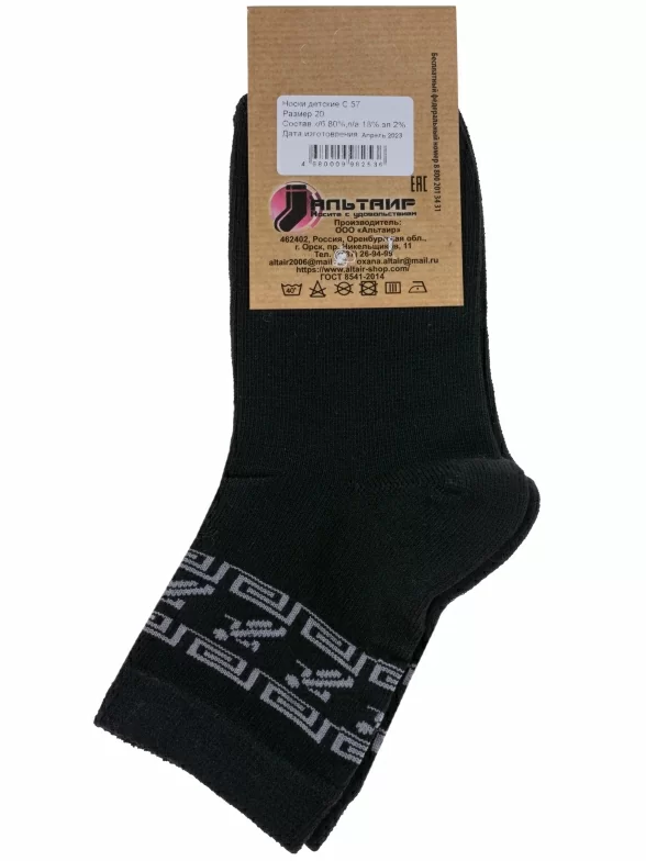 Круглогодичные укороченные детские носки, цвет черный, спортивные, повседневные, шов обычный (не бесшовные), принт (рисунок): с узором, спортивные, состав: 80% хлопок, 18% полиамид, 2% эластан, арт. С57. Производитель «ООО Альтаир, г. Орск, Оренбургская обл, Россия» под брендом «Альтаир».