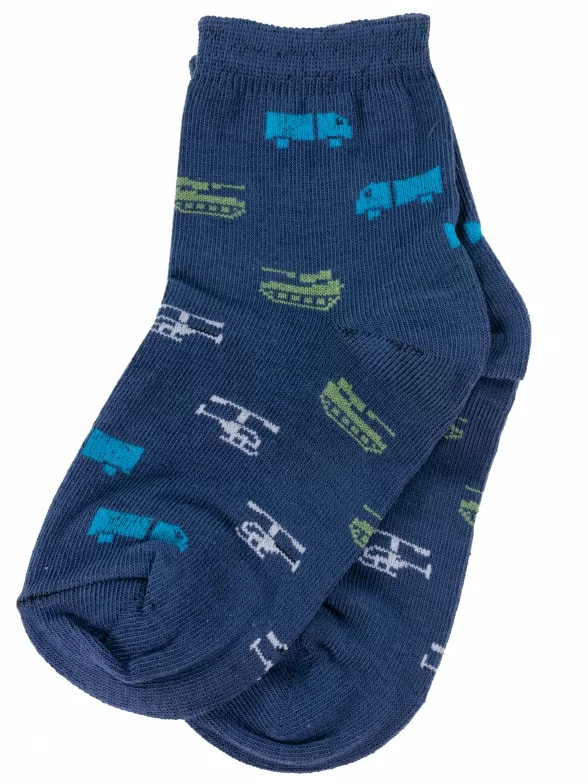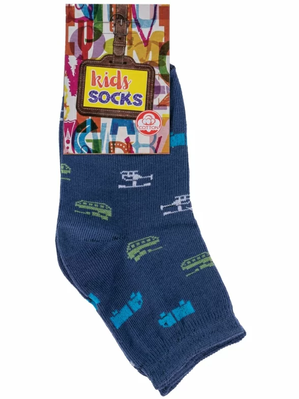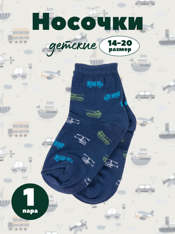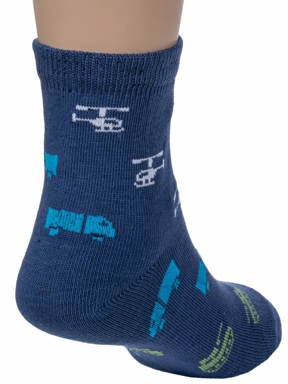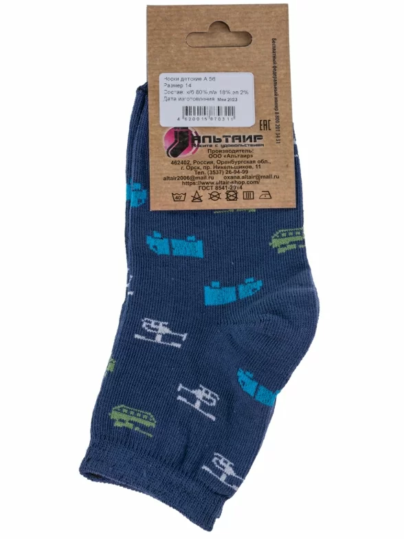 Круглогодичные укороченные детские носки, цвет синий-джинс, повседневные, шов обычный (не бесшовные), принт (рисунок): транспорт, с узором, состав: 80% хлопок, 18% полиамид, 2% эластан, арт. А56. Производитель «ООО Альтаир, г. Орск, Оренбургская обл, Россия» под брендом «Альтаир».