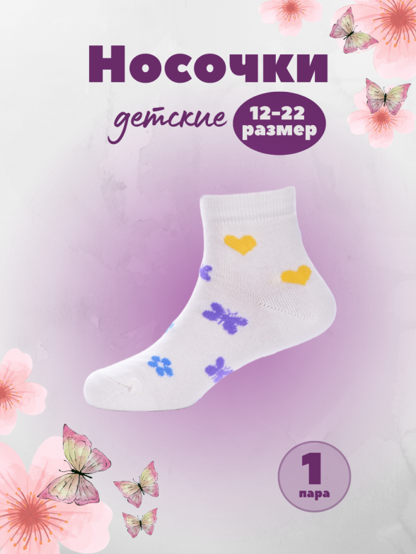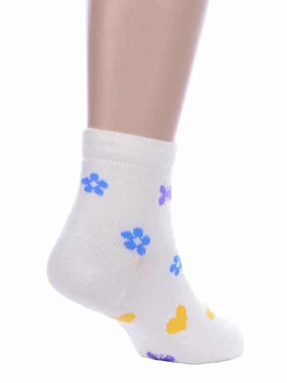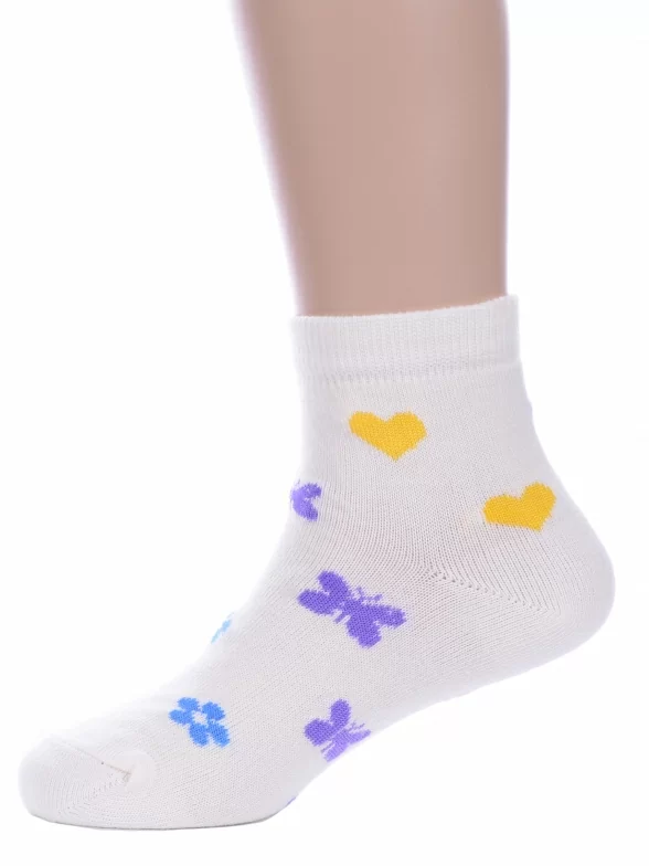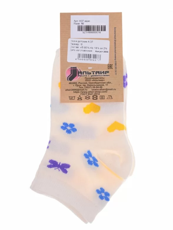 Круглогодичные укороченные детские носки, цвет бежевый-кремовый, повседневные, шов обычный (не бесшовные), принт (рисунок): сердечки / поцелуи / любовь, бабочки / бантики, состав: 80% хлопок, 18% полиамид, 2% эластан, арт. А37. Производитель «ООО Альтаир, г. Орск, Оренбургская обл, Россия» под брендом «Альтаир».