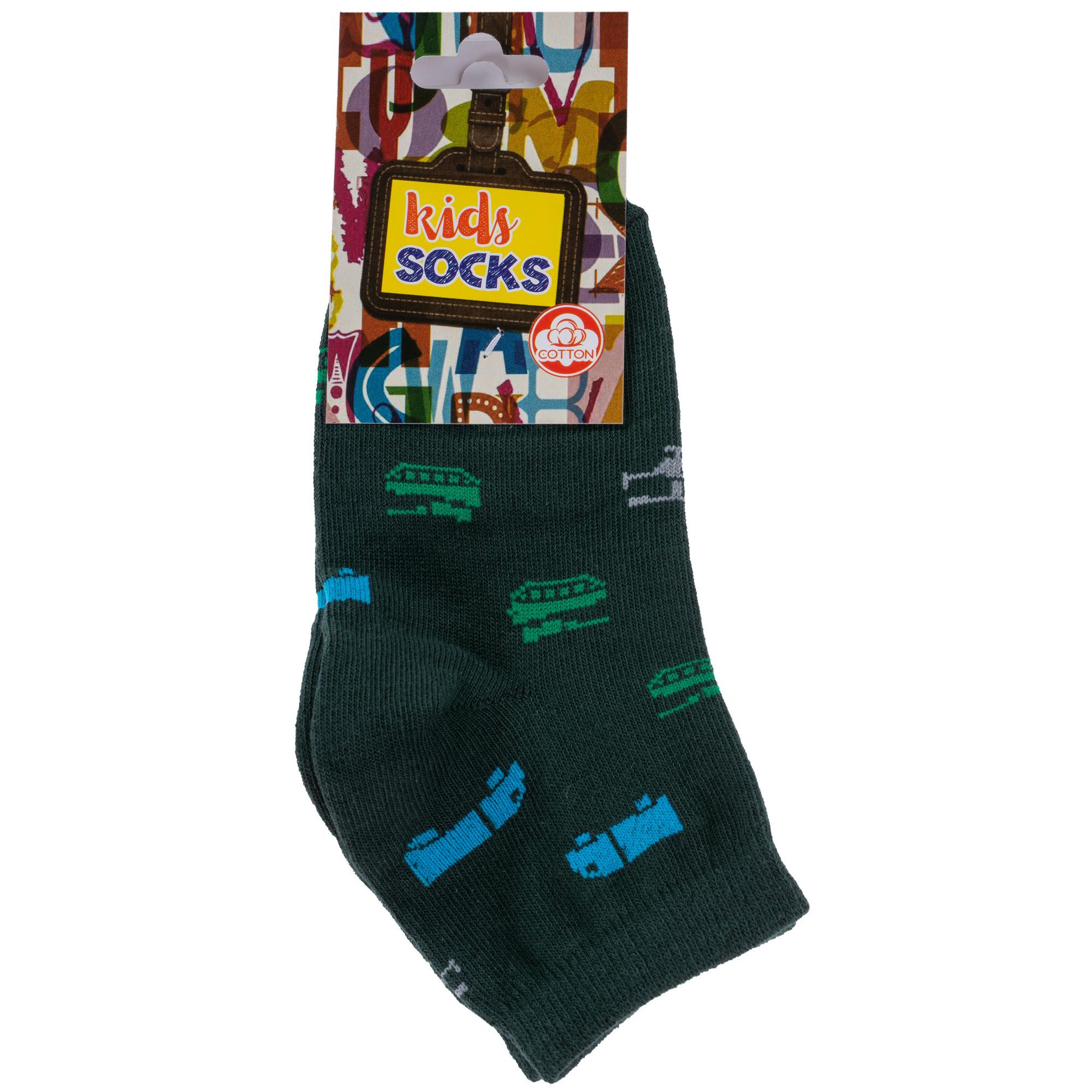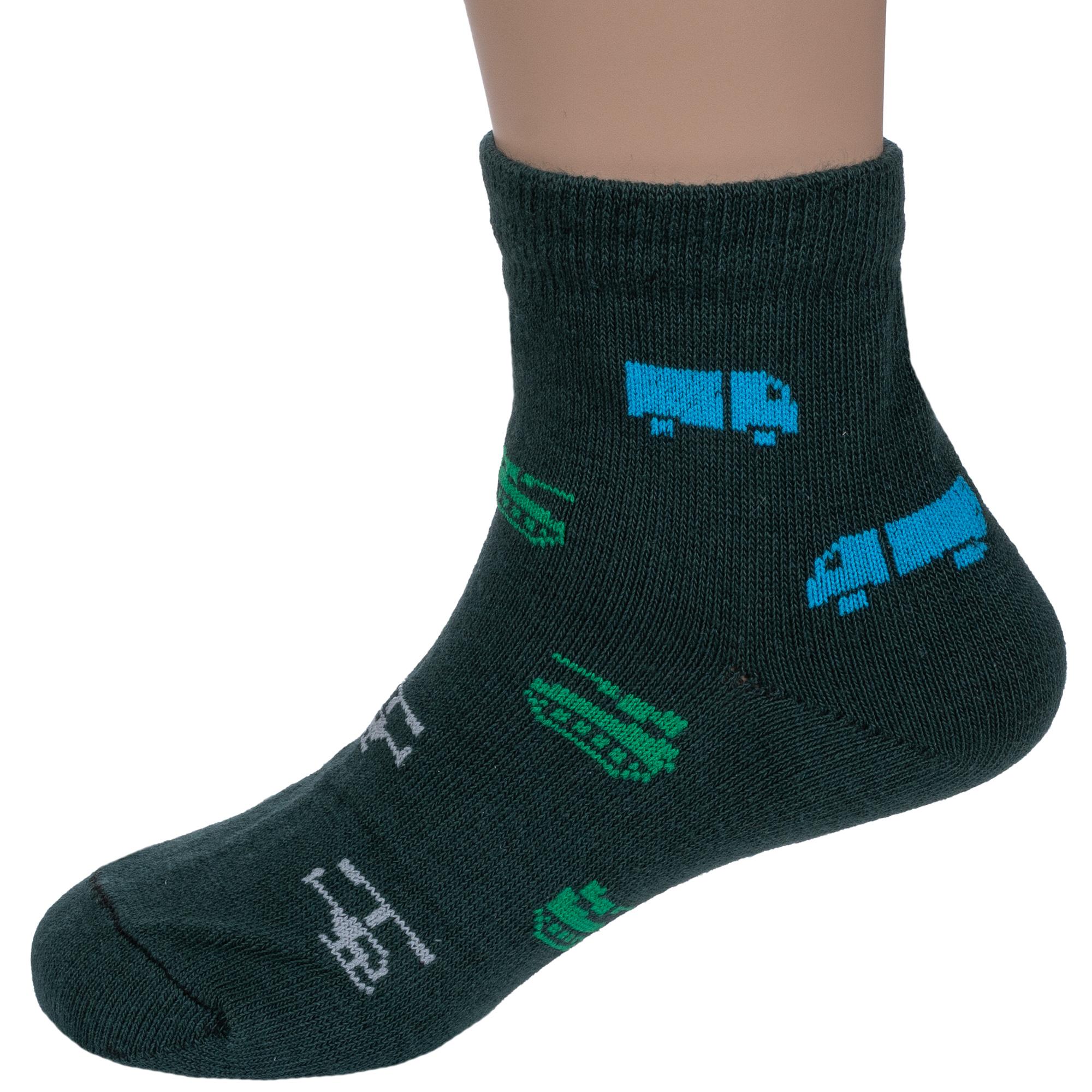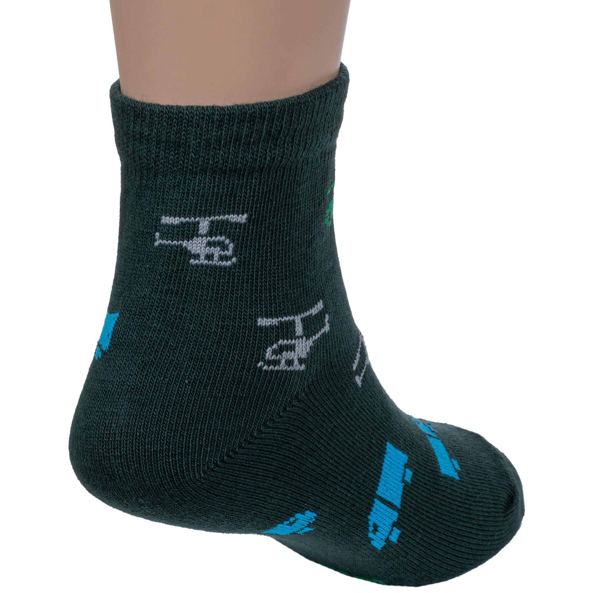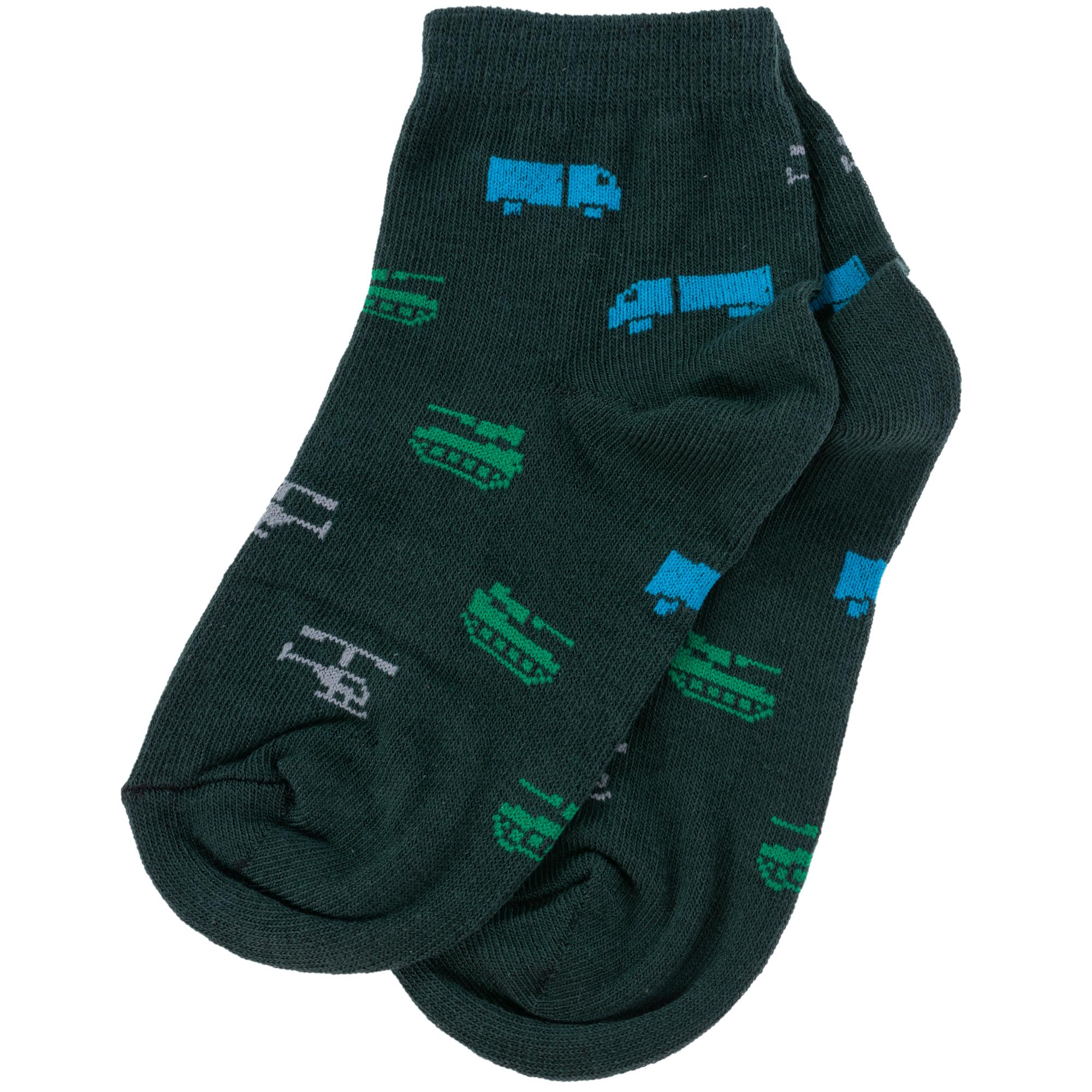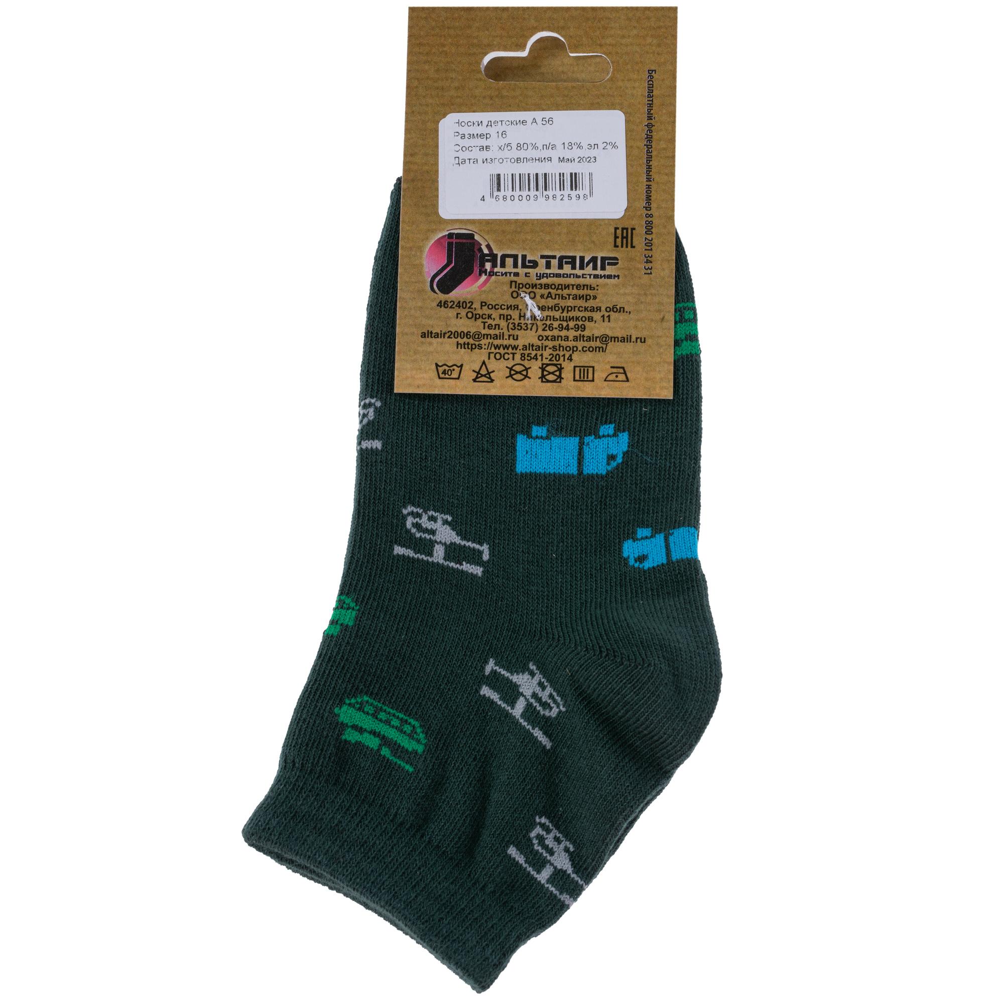 Круглогодичные укороченные детские носки, цвет хаки-зеленый, повседневные, шов обычный (не бесшовные), принт (рисунок): транспорт, с узором, состав: 80% хлопок, 18% полиамид, 2% эластан, арт. А56. Производитель «ООО Альтаир, г. Орск, Оренбургская обл, Россия» под брендом «Альтаир».