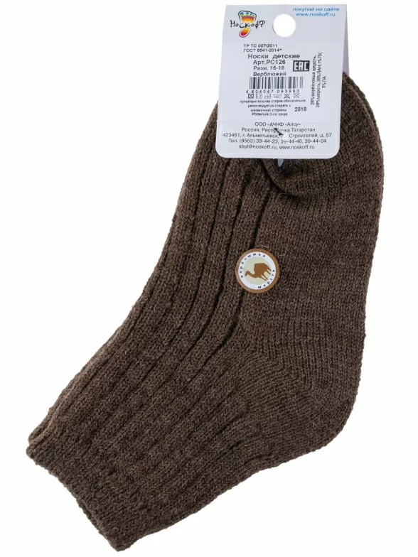 Зимние укороченные детские носки, цвет коричневый, теплые, классические, шов обычный (не бесшовные), принт (рисунок): в рубчик, однотонный, состав: 28% верблюжья шерсть, 28% шерсть, 38% ПАН, 5% полиамид, 1% полиуретан (эластан), арт. РС126. Производитель «Носкофф» Россия под брендом «Носкофф (алсу)».