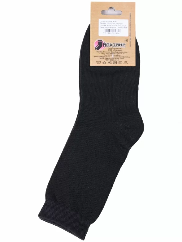 Круглогодичные средней длины детские носки, цвет черный, классические, шов обычный (не бесшовные), принт (рисунок): без рисунков / узоров, однотонный, состав: 80% хлопок, 18% полиамид, 2% эластан, арт. А94. Производитель «ООО Альтаир, г. Орск, Оренбургская обл, Россия» под брендом «Альтаир».