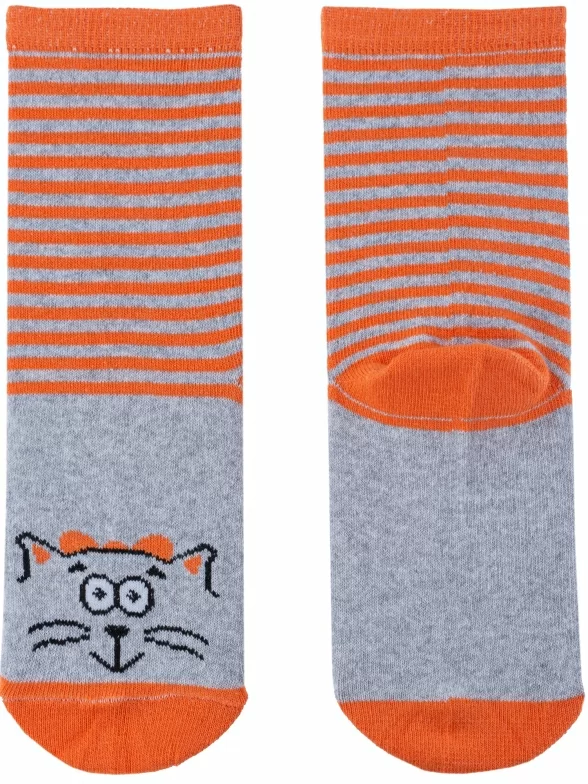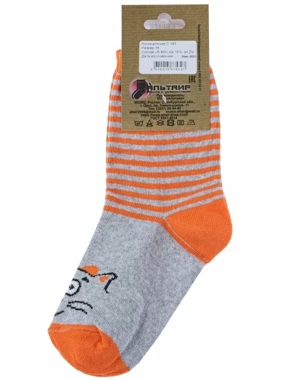 Круглогодичные средней длины детские носки, цвет оранжевый-многоцветные (мультиколор), повседневные, шов обычный (не бесшовные), принт (рисунок): животные, с узором, состав: 80% хлопок, 18% полиамид, 2% эластан, арт. С183. Производитель «ООО Альтаир, г. Орск, Оренбургская обл, Россия» под брендом «Альтаир».