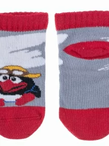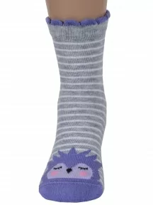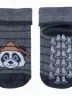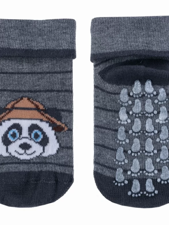 Детские носки с антискользящим рельефным узором на подошве. Модель оформлена принтом с пандой на фоне контрастных полосок. Носки изготовлены из хлопка с добавлением эластана и полиамида, которые придают трикотажу прочность и эластичность.