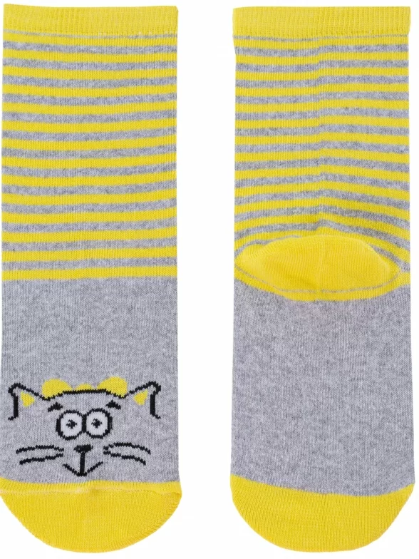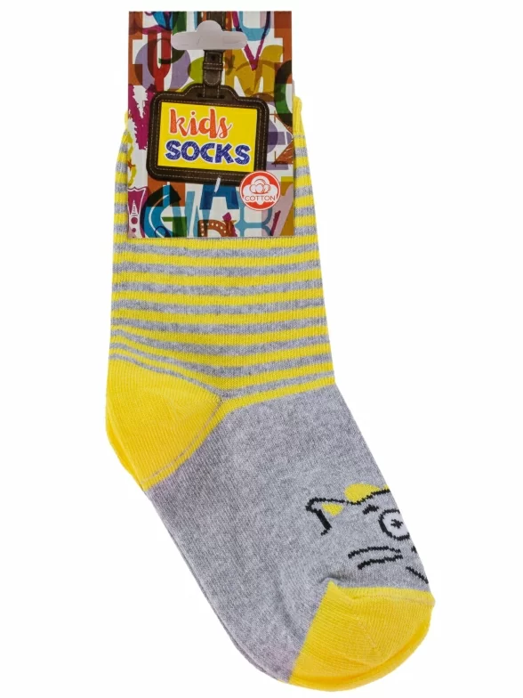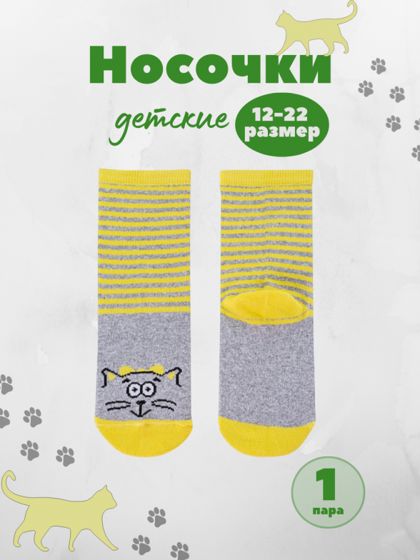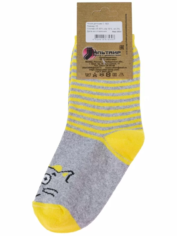 Круглогодичные средней длины детские носки, цвет многоцветные (мультиколор)-желтый, повседневные, шов обычный (не бесшовные), принт (рисунок): животные, с узором, состав: 80% хлопок, 18% полиамид, 2% эластан, арт. С183. Производитель «ООО Альтаир, г. Орск, Оренбургская обл, Россия» под брендом «Альтаир».