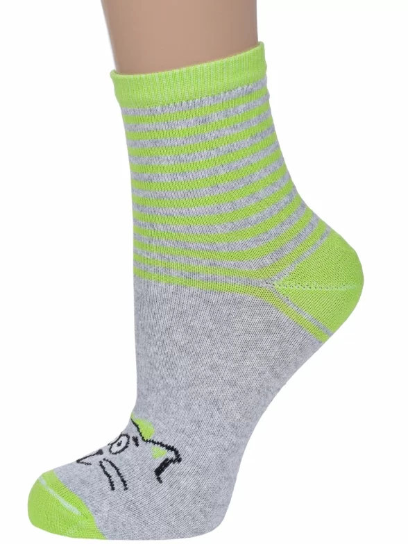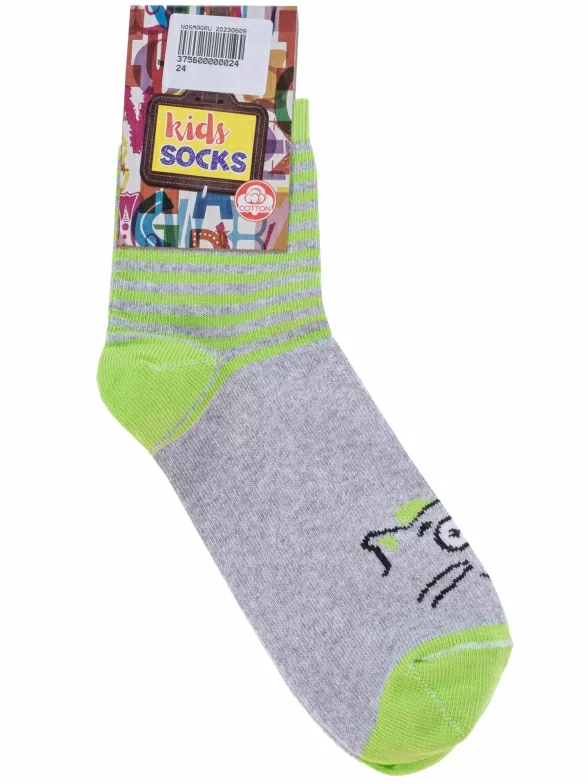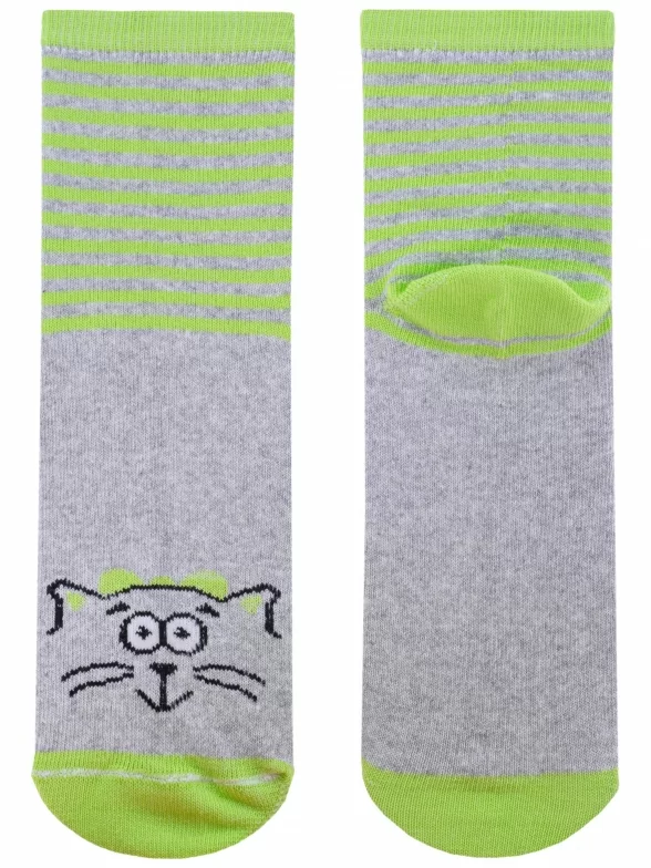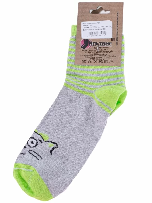 Круглогодичные средней длины детские носки, цвет салатовый-многоцветные (мультиколор), повседневные, шов обычный (не бесшовные), принт (рисунок): животные, с узором, состав: 80% хлопок, 18% полиамид, 2% эластан, арт. С183. Производитель «ООО Альтаир, г. Орск, Оренбургская обл, Россия» под брендом «Альтаир».