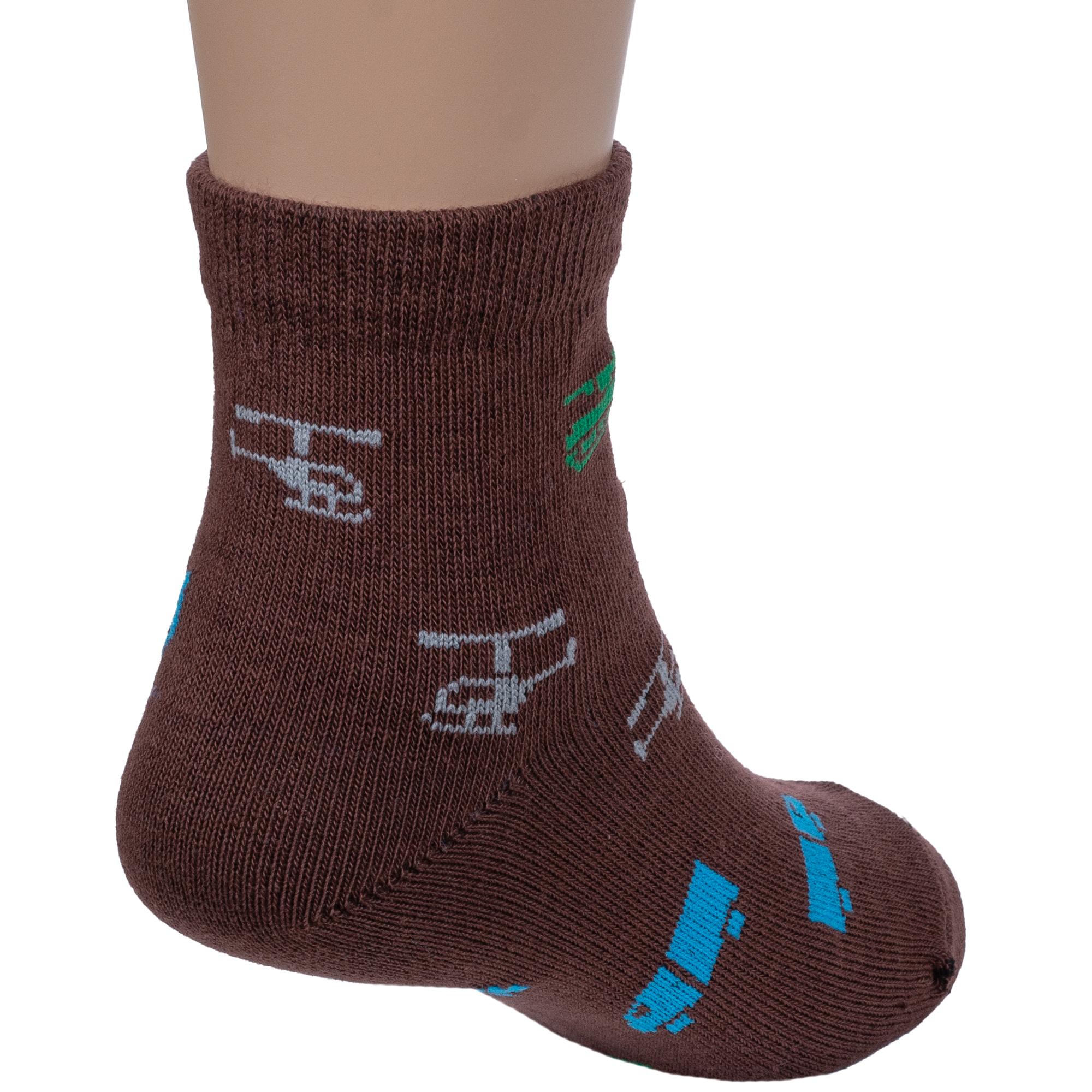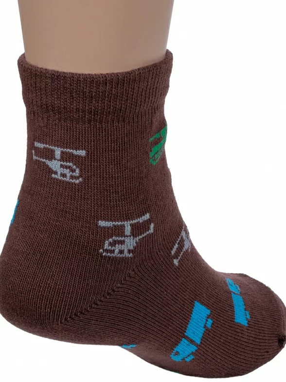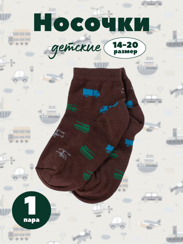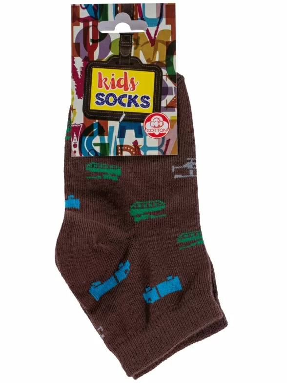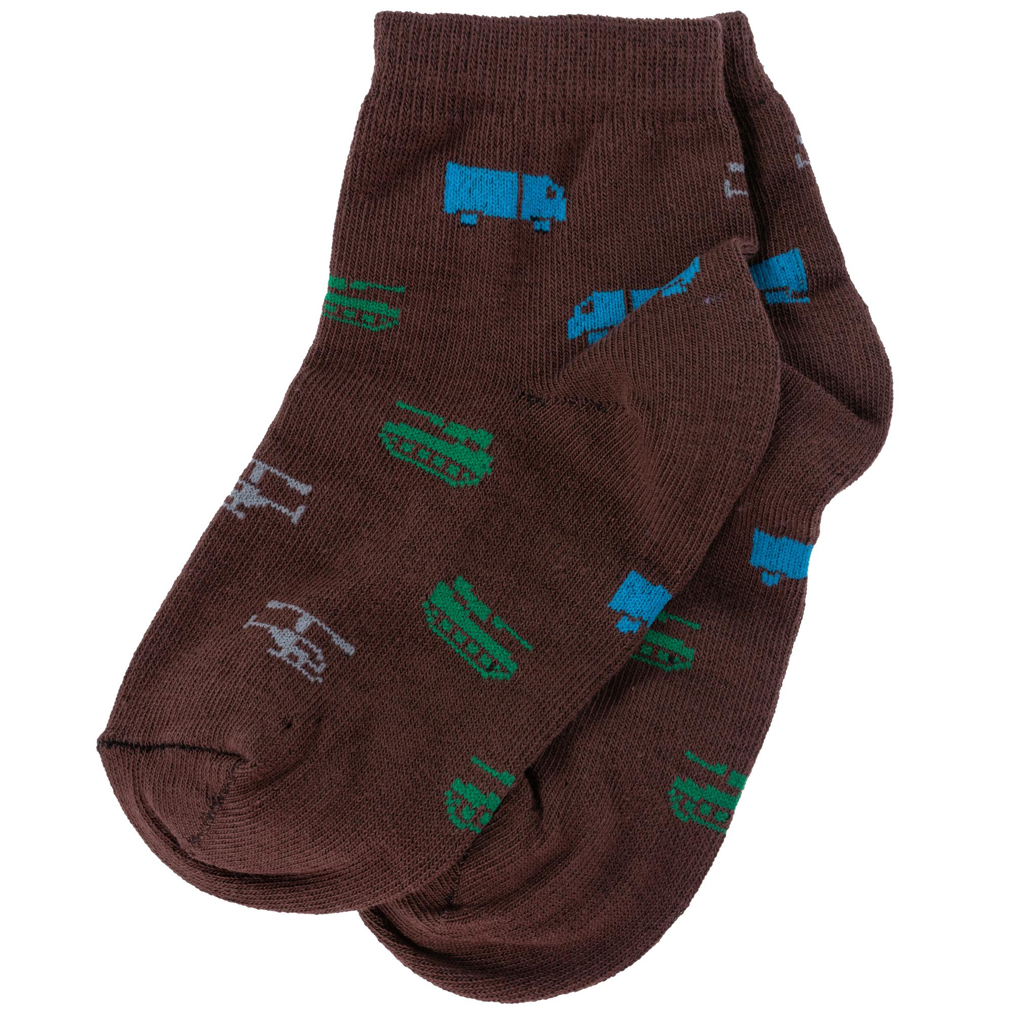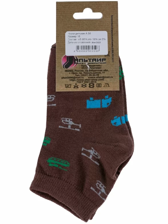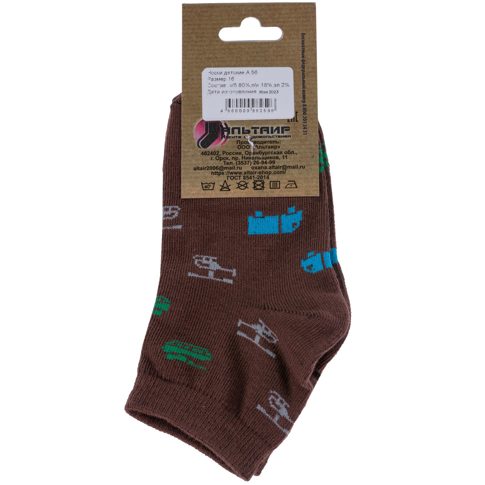 Круглогодичные укороченные детские носки, цвет коричневый, повседневные, шов обычный (не бесшовные), принт (рисунок): транспорт, с узором, состав: 80% хлопок, 18% полиамид, 2% эластан, арт. А56. Производитель «ООО Альтаир, г. Орск, Оренбургская обл, Россия» под брендом «Альтаир».