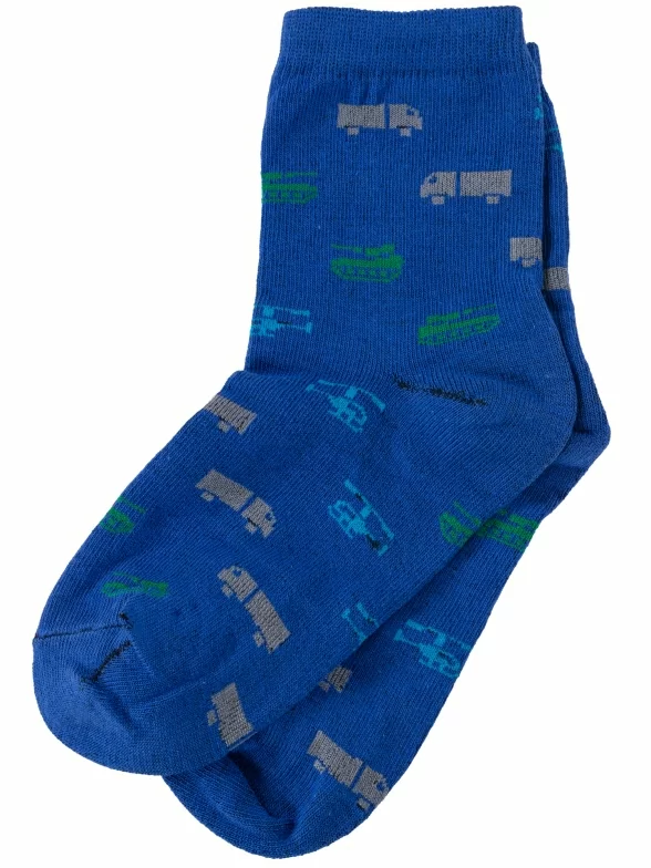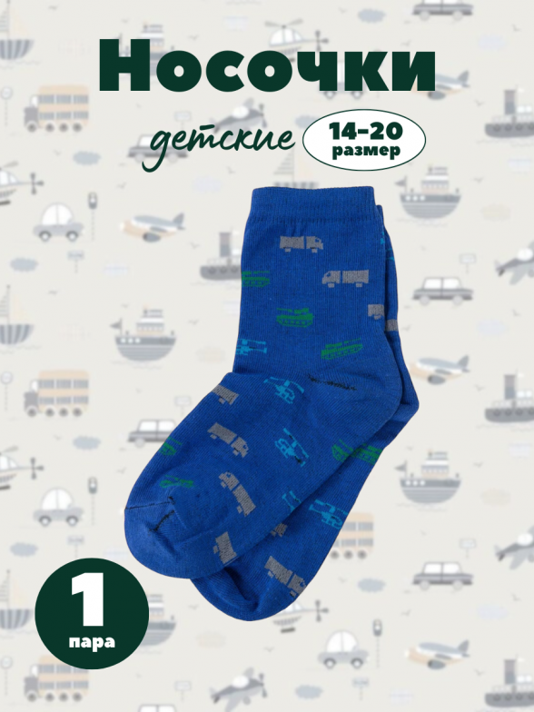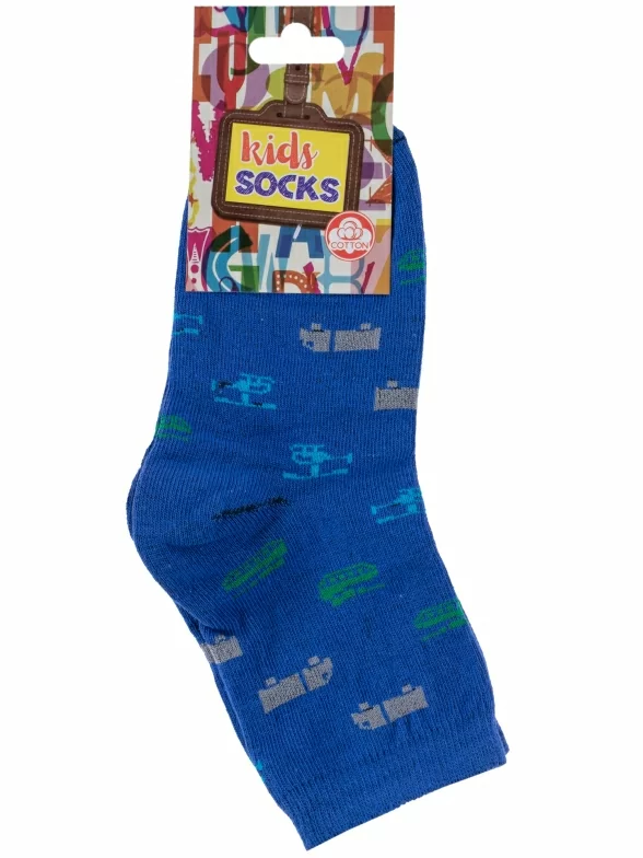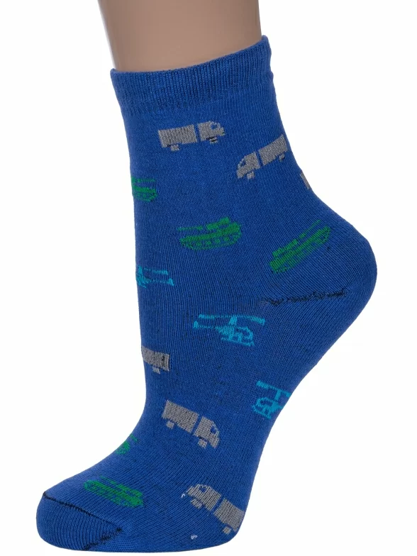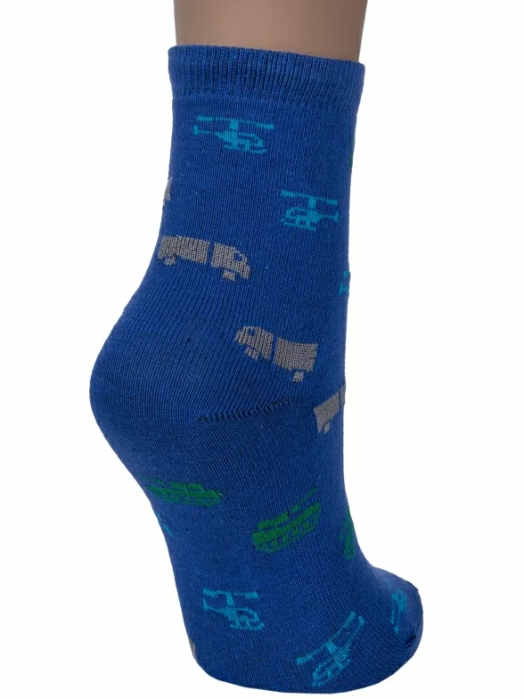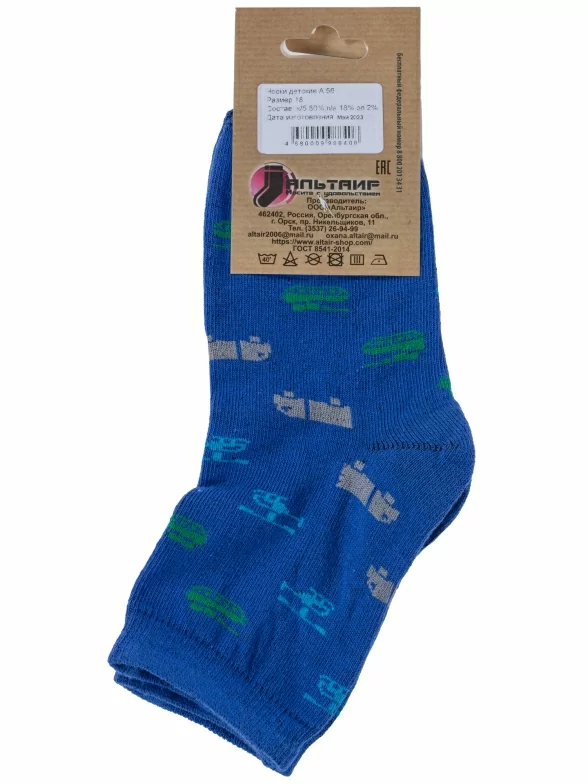 Круглогодичные укороченные детские носки, цвет синий, повседневные, шов обычный (не бесшовные), принт (рисунок): транспорт, с узором, состав: 80% хлопок, 18% полиамид, 2% эластан, арт. А56. Производитель «ООО Альтаир, г. Орск, Оренбургская обл, Россия» под брендом «Альтаир».