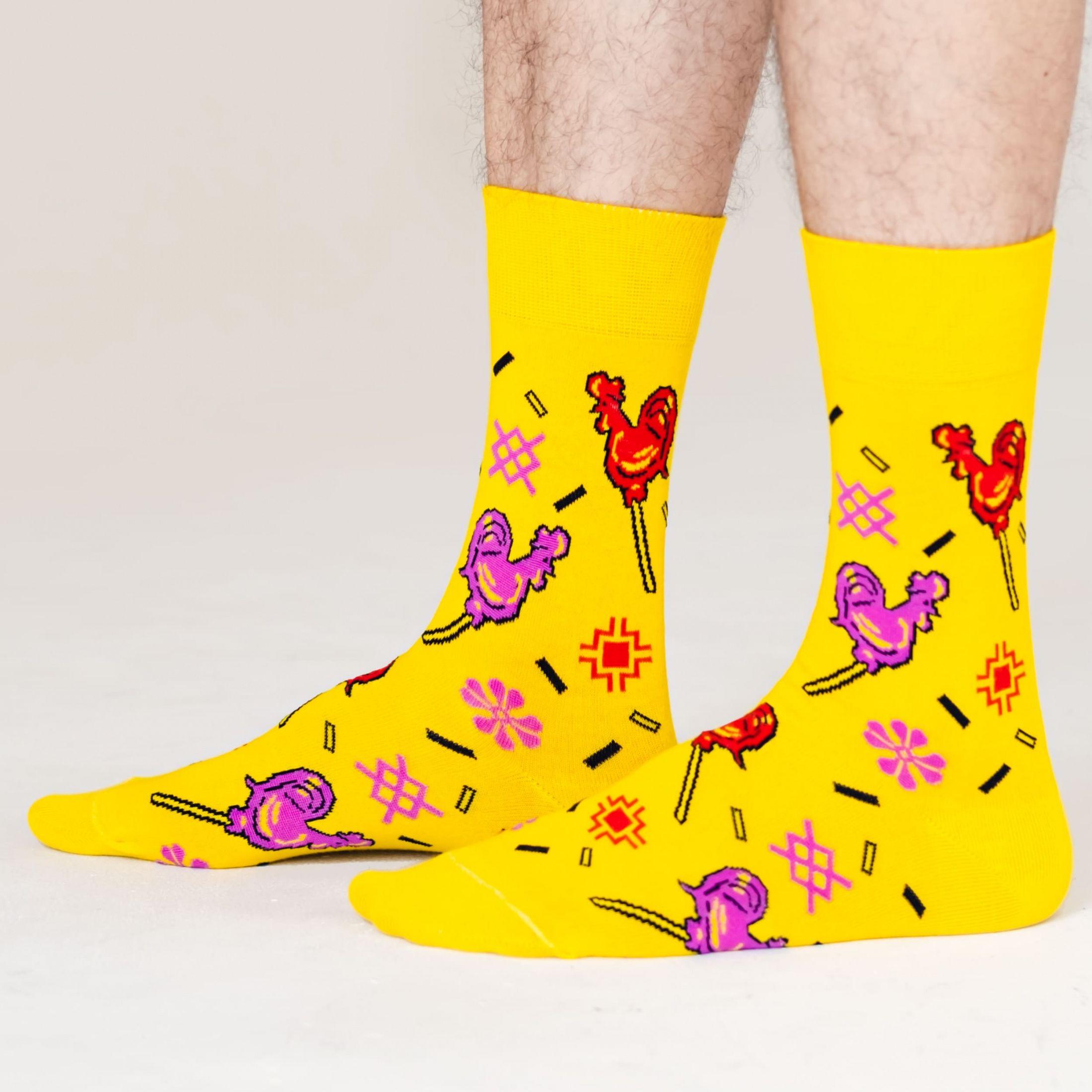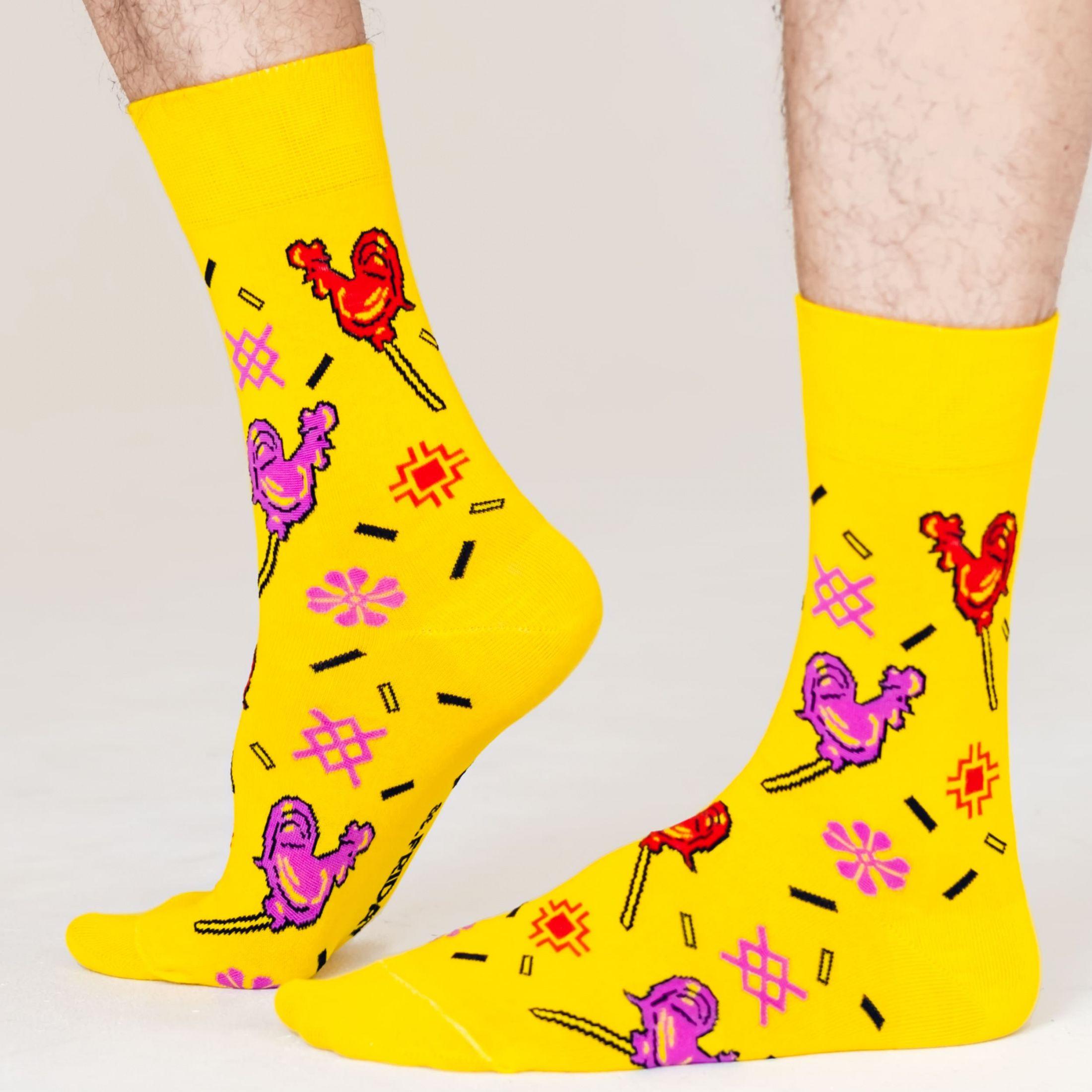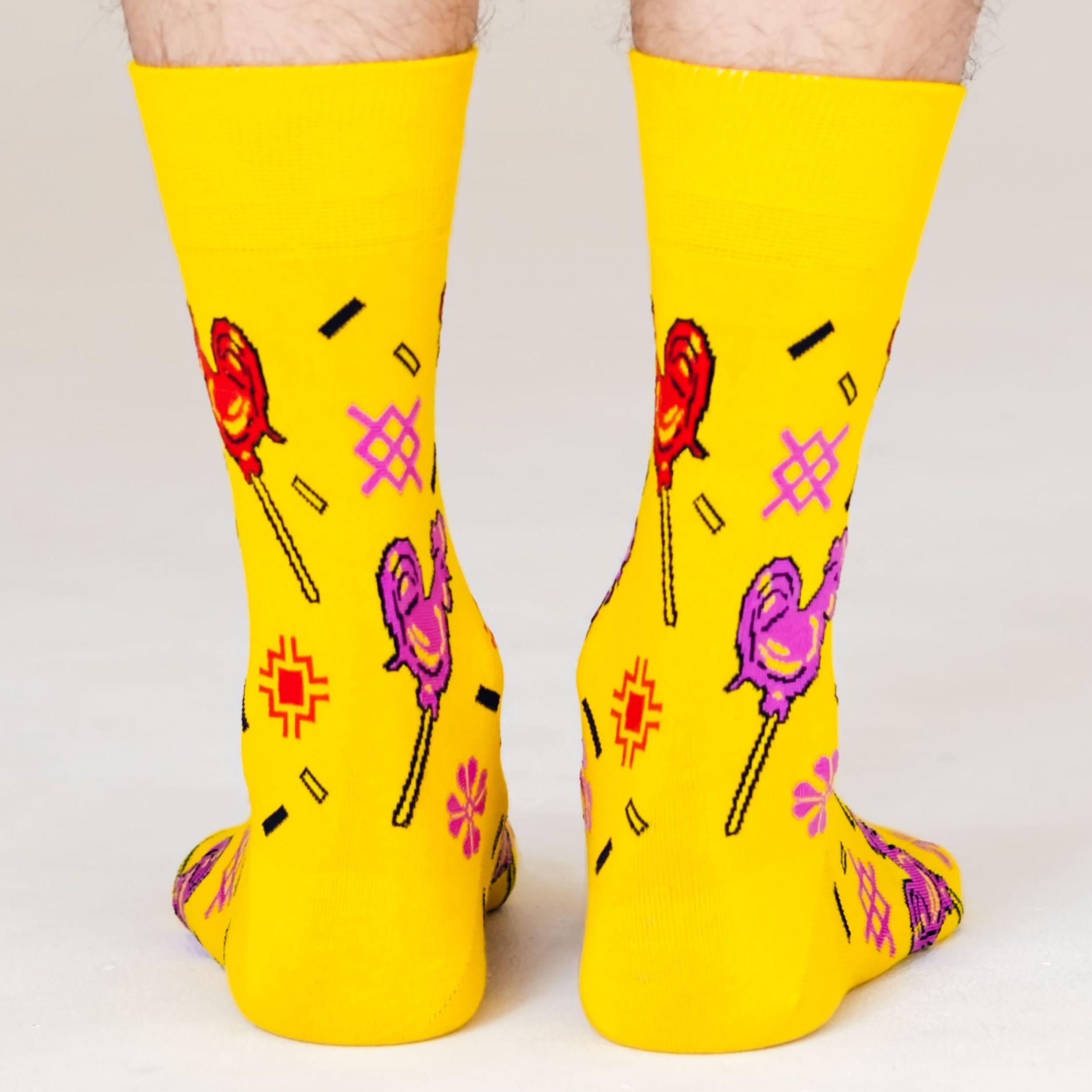 Носки унисекс "Гладкий и пунцовый, сладкий, леденцовый!" с принтом в виде сахарного петушка на палочке - именитый леденец заслуживает персональное место на носках!