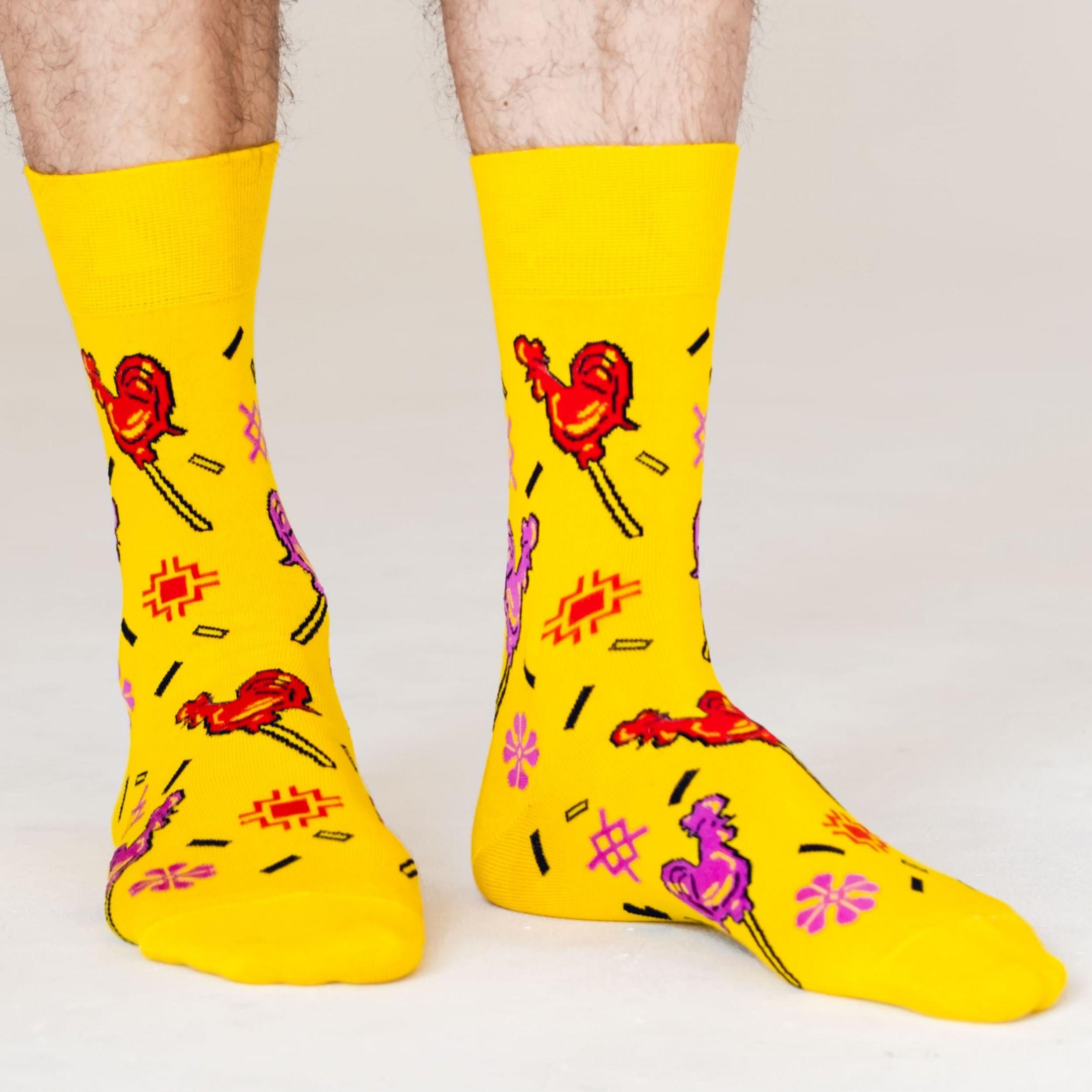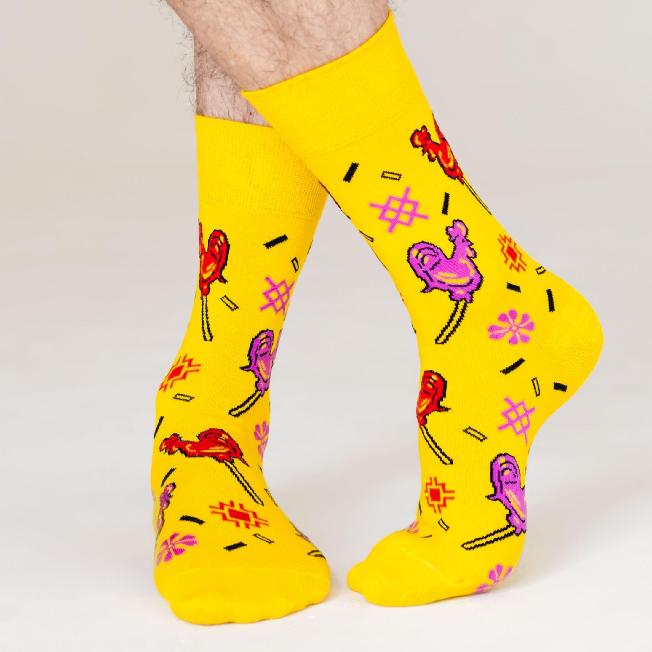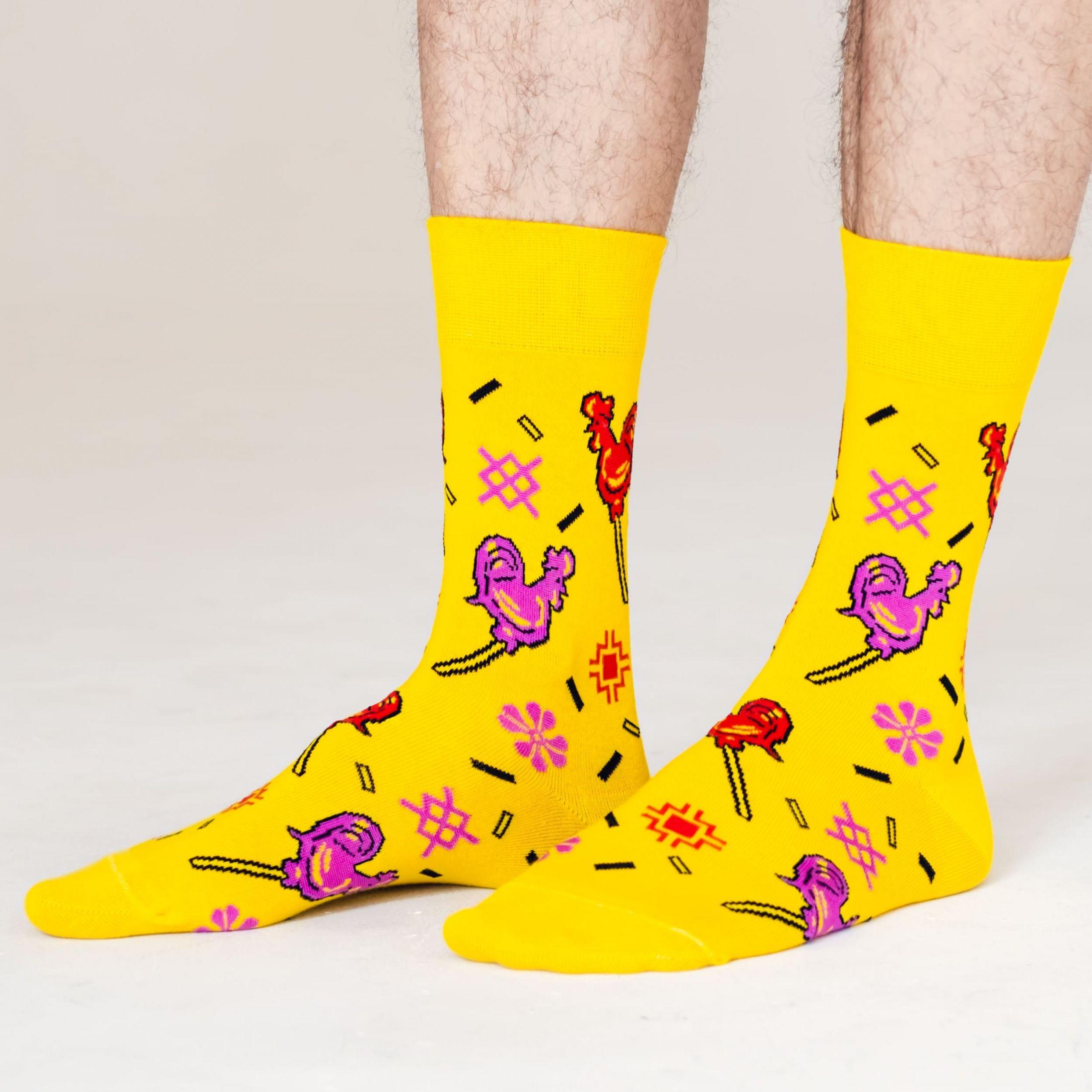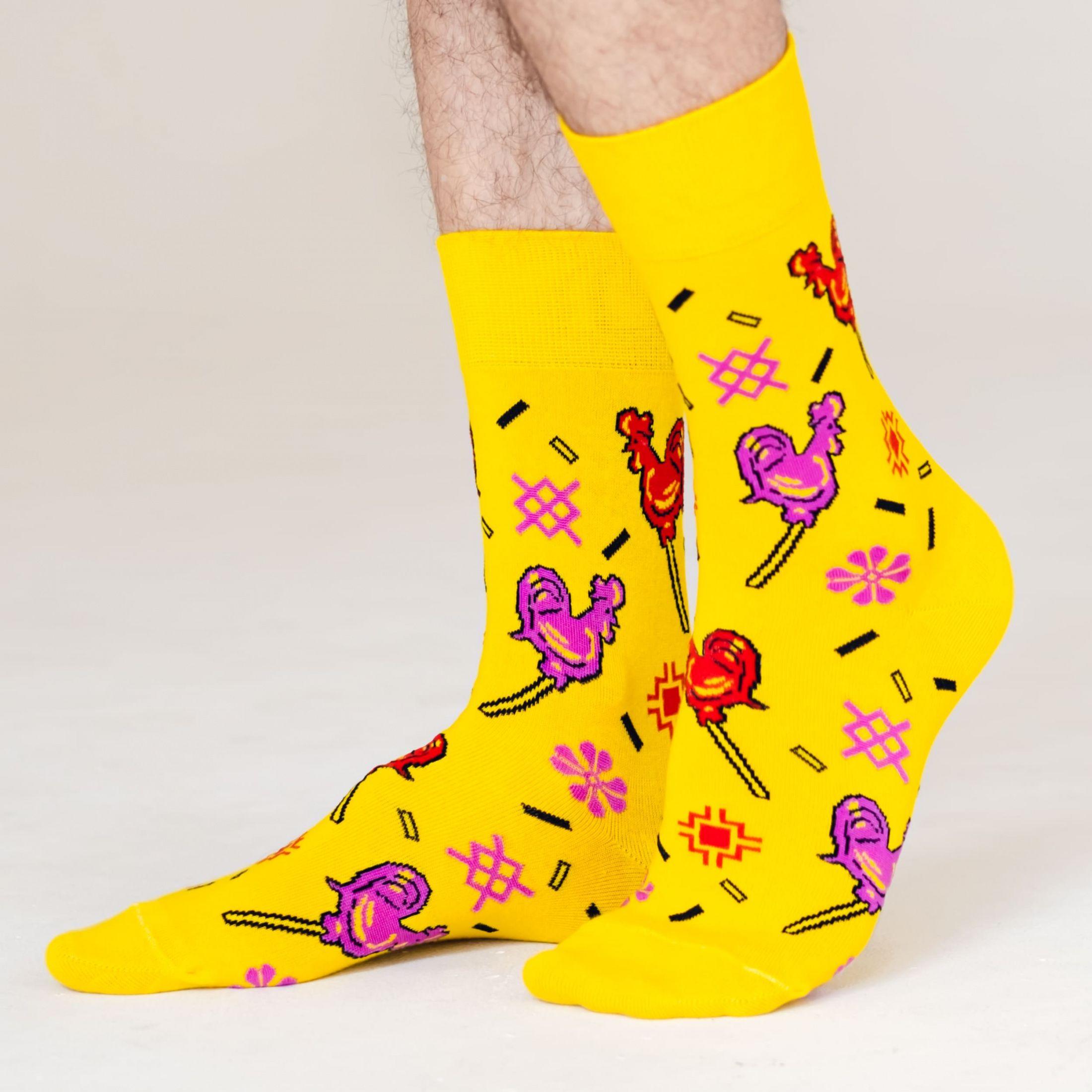 Модель средней длины с двойным бортом (манжетом резинки) и ощутимым уплотнением в месте шва на мыске. Пара таких носков желтого цвета поставляется с фабричной этикеткой в обычном или курьер-пакете.