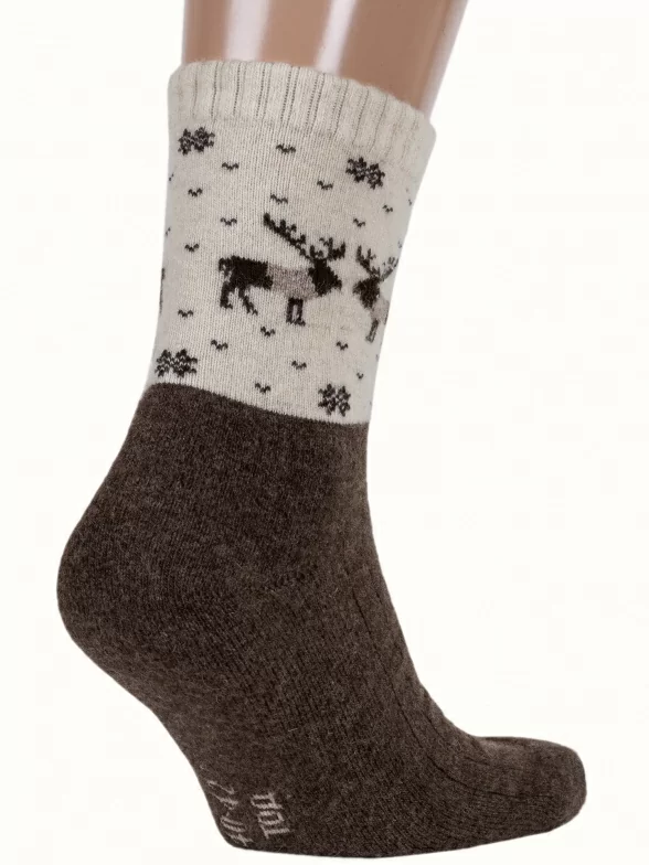 Модель средней длины с небольшим узором в виде оленей на светлом паголенке и с вывязанным на стопе размером.