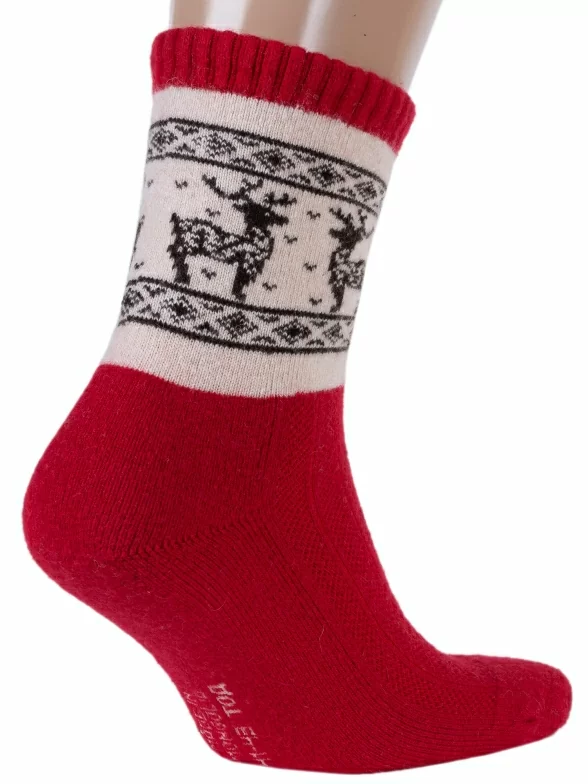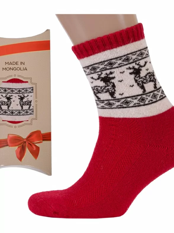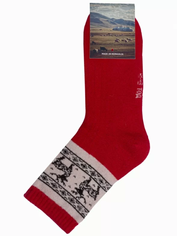 Яркие шерстяные носки из Монголии. Состоят на 70% из шерсти и на 30% из вискозы. Изделия плотные, качественные и износостойкие. Сохраняют свою форму, не вытягиваются. Идеально подойдут для зимних прогулок. Подарят тепло и уют в самые суровые морозы. Модель красного цвета, украшена симпатичным узором в виде оленей и орнамента.