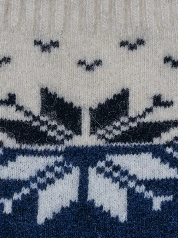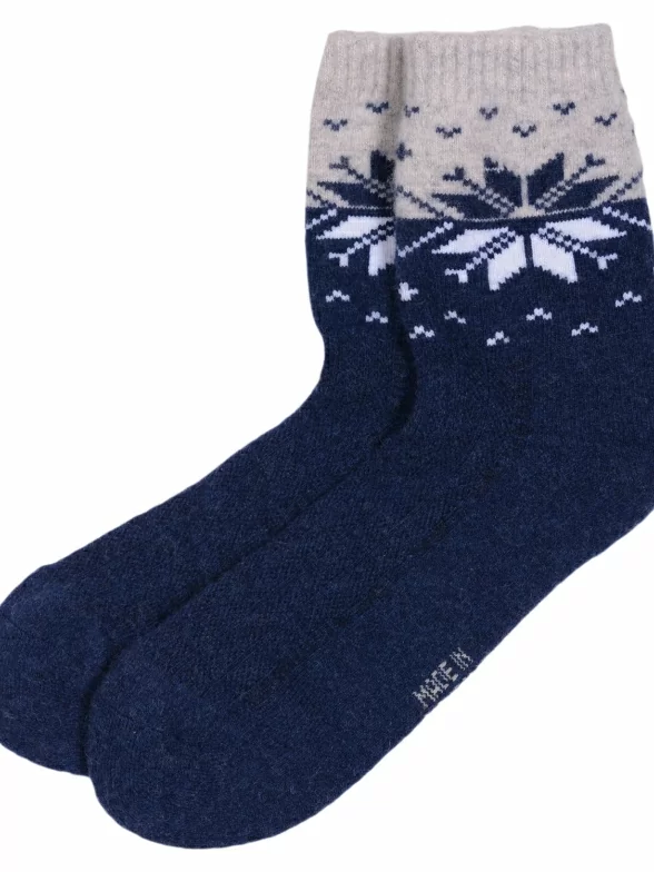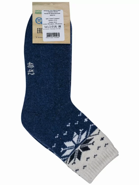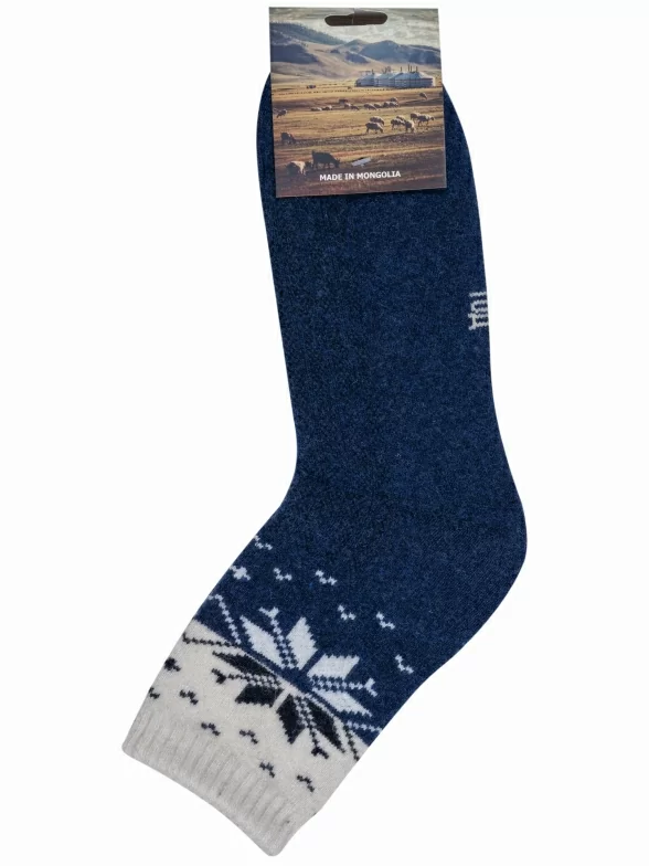 Шерстяные носки из Монголии синего цвета. Состоят на 100% из шерсти. Изделия плотные, качественные и износостойкие. Сохраняют свою форму, не вытягиваются. Идеально подойдут для зимних прогулок. Подарят тепло и уют в самые суровые морозы. Модель украшена симпатичным узором - ромбами и крупными снежинками.