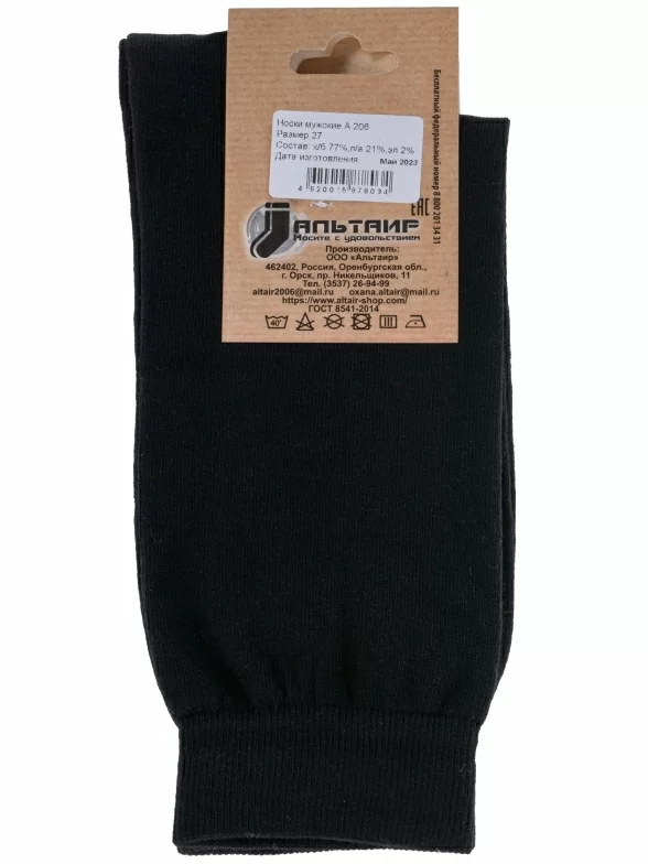 Круглогодичные средней длины мужские носки, цвет черный, классические, шов обычный (не бесшовные), принт (рисунок): однотонный, без рисунков/узоров, состав: 77% хлопок, 21% полиамид, 2% эластан, арт. А206. Производитель «ООО Альтаир, г. Орск, Оренбургская обл, Россия» под брендом «Альтаир».