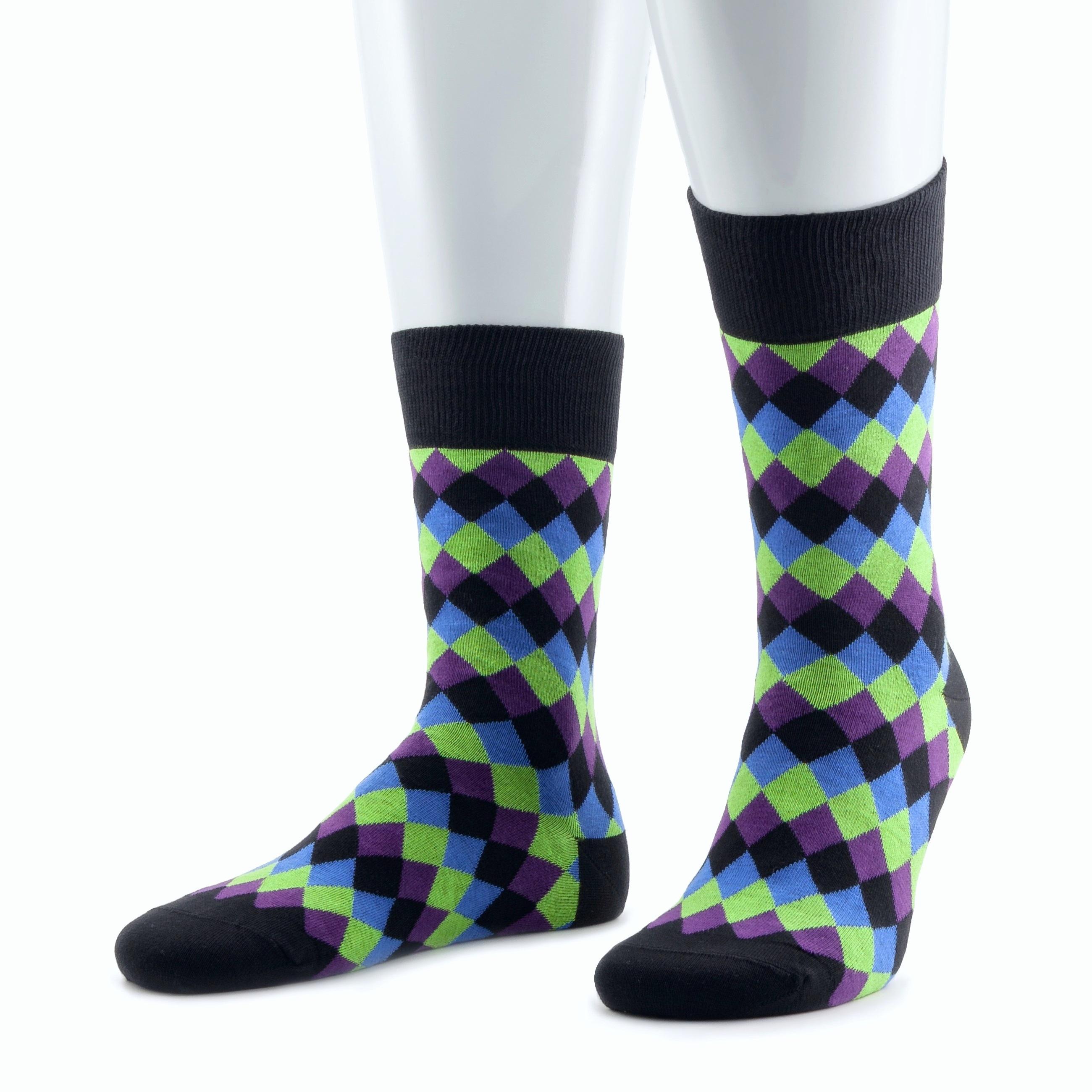 Модель средней длины с плоским малоощутимым швом на мыске и с двойным бортом (манжетом резинки); украшена принтом в виде разноцветных ромбов.