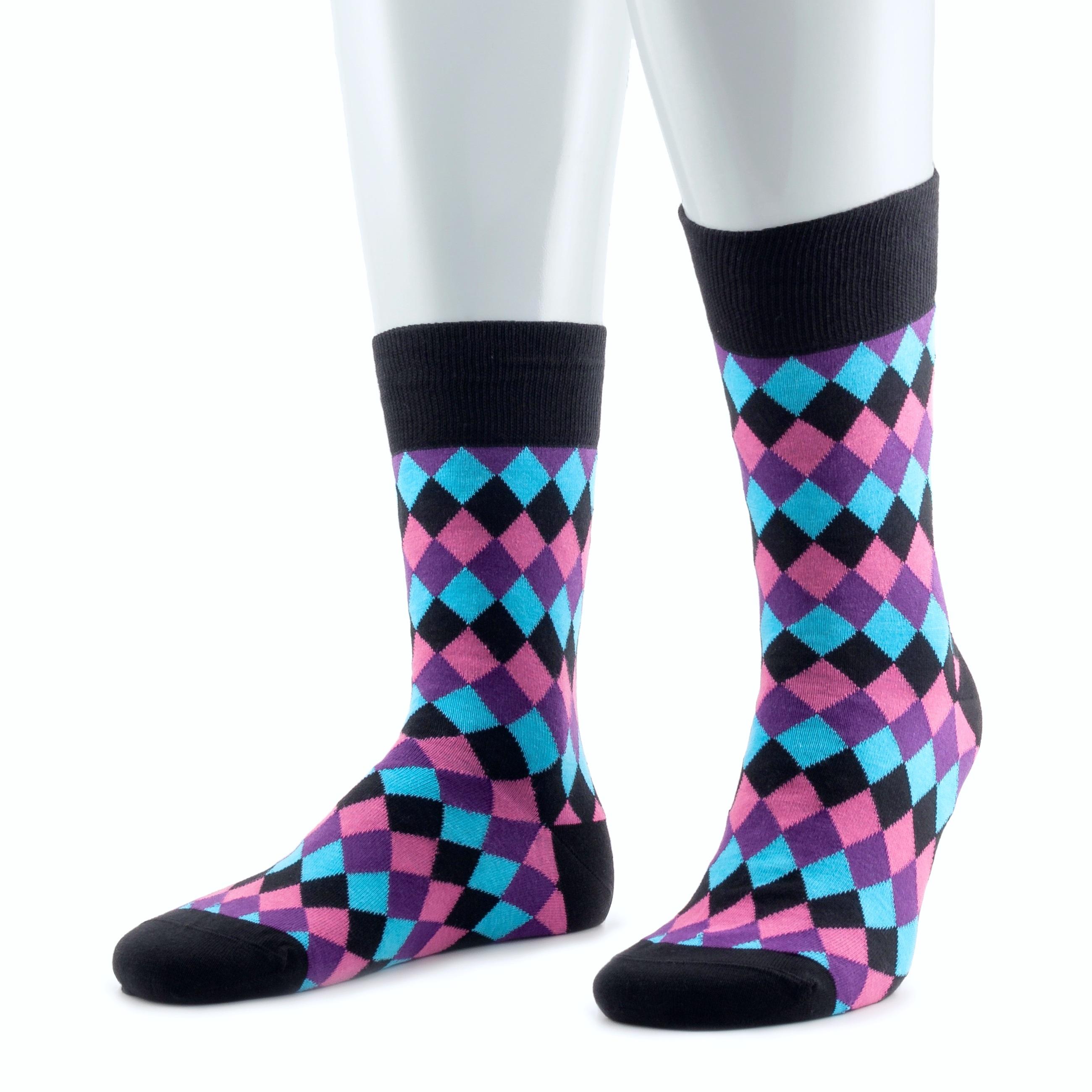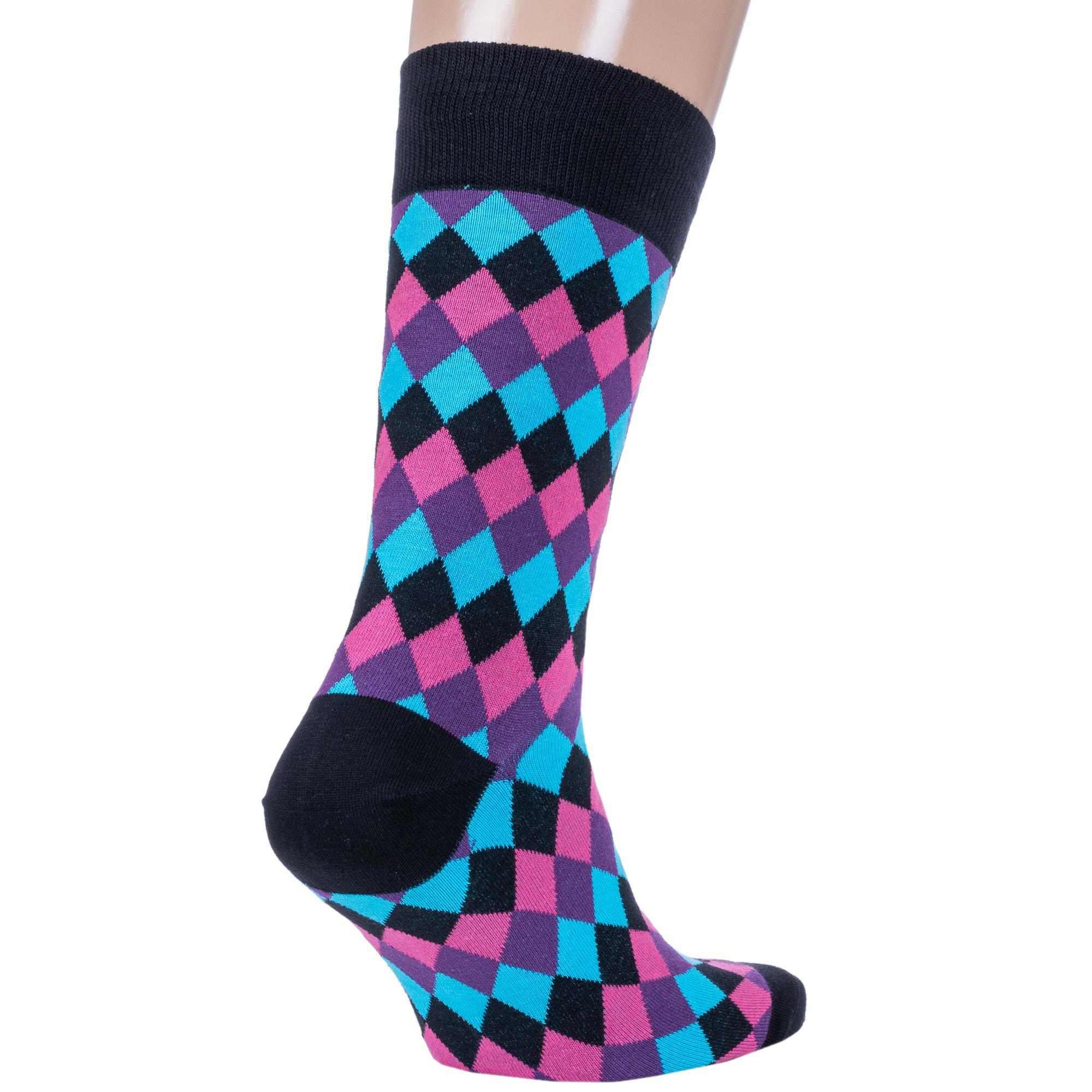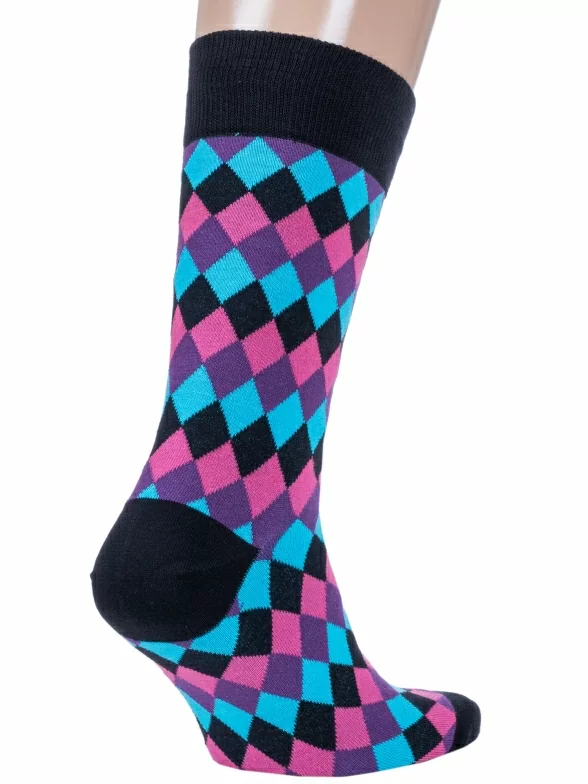 Модель средней длины с плоским малоощутимым швом на мыске и с двойным бортом (манжетом резинки); украшена принтом в виде разноцветных ромбов.