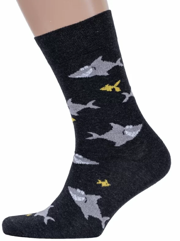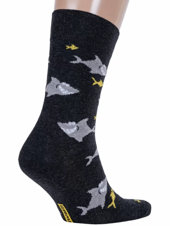 Необычные фантазийные носки, оформленные орнаментом с акулами. Модель классической длины с двойным бортом и неощутимым швом на мыске.