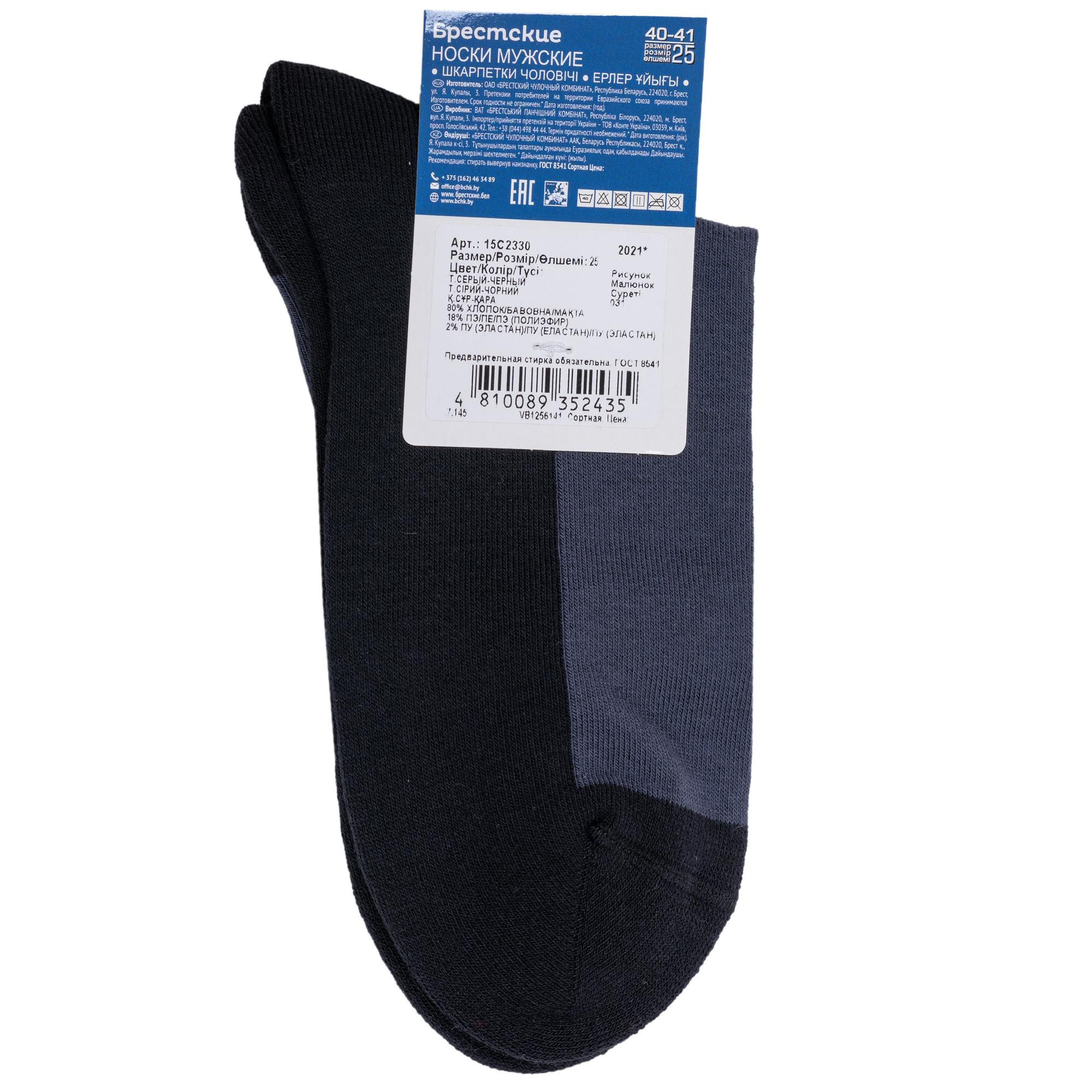 Круглогодичные или зимние укороченные мужские носки, цвет темно-серый, теплые, спортивные, с махровым следом, шов кеттельный (бесшовная технология), принт (рисунок): однотонный, без рисунков/узоров, состав: 80% хлопок, 18% полиэстер, 2% эластан, арт. 15С2330. Производитель «Брестский чулочный комбинат ОАО, Беларусь» под брендом «Брестские (бчк)».