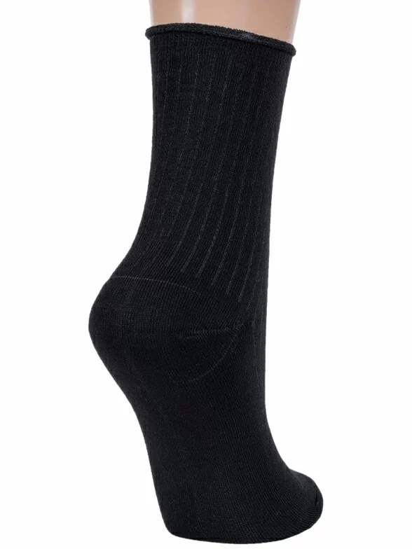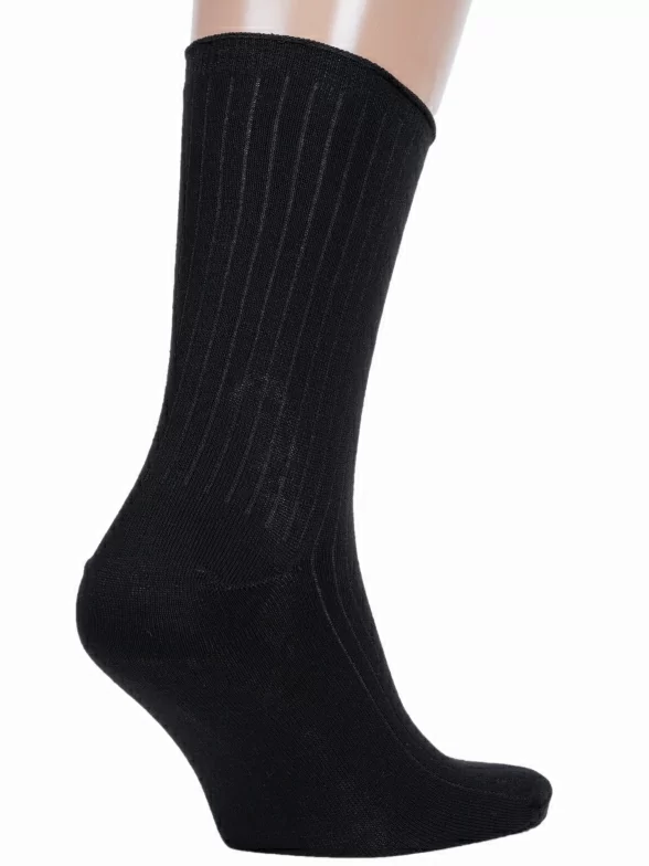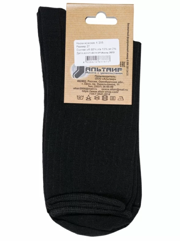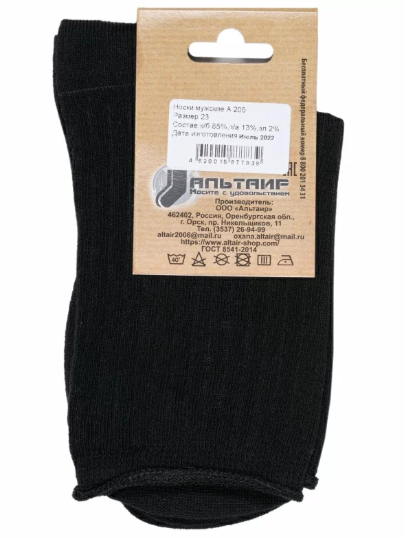 Круглогодичные средней длины носки унисекс, цвет черный, медицинские, шов обычный (не бесшовные), принт (рисунок): в рубчик, однотонный, состав: 85% хлопок, 13% полиамид, 2% эластан, арт. А205. Производитель «ООО Альтаир, г. Орск, Оренбургская обл, Россия» под брендом «Альтаир».