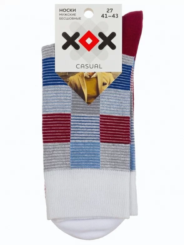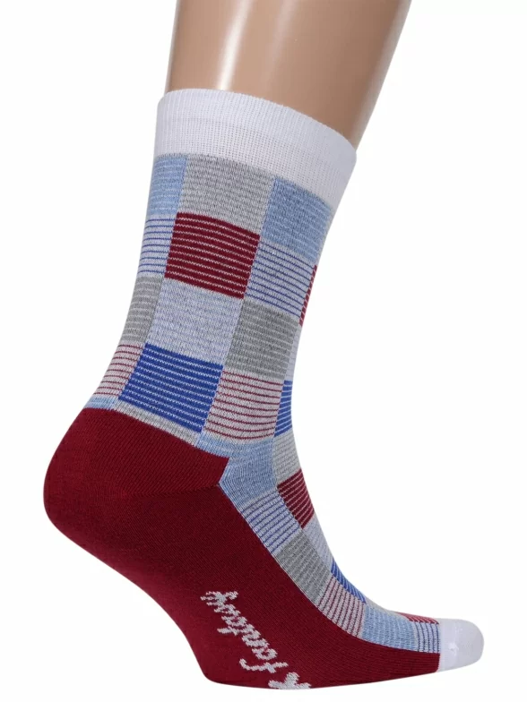 Мужские носки классической длины, оформленные контрастными квадратами из тонких цветных полос. Они отлично сочетаются с повседневной одеждой и смотрятся ярко и необычно. Носки сделаны из плотного приятного трикотажа и очень удобны.