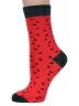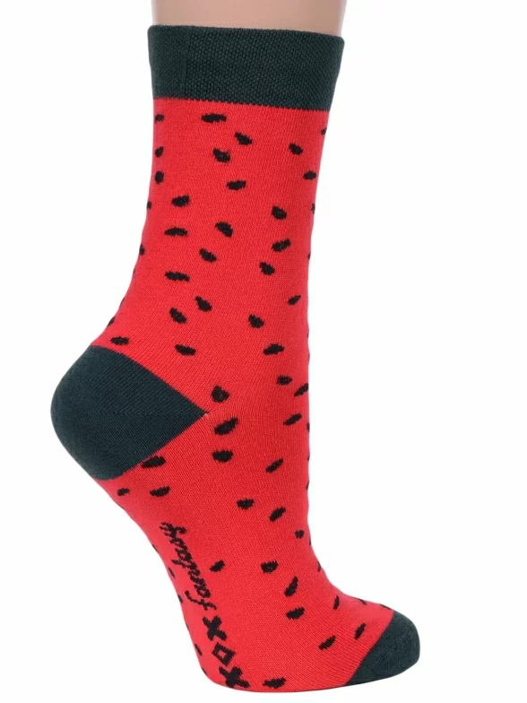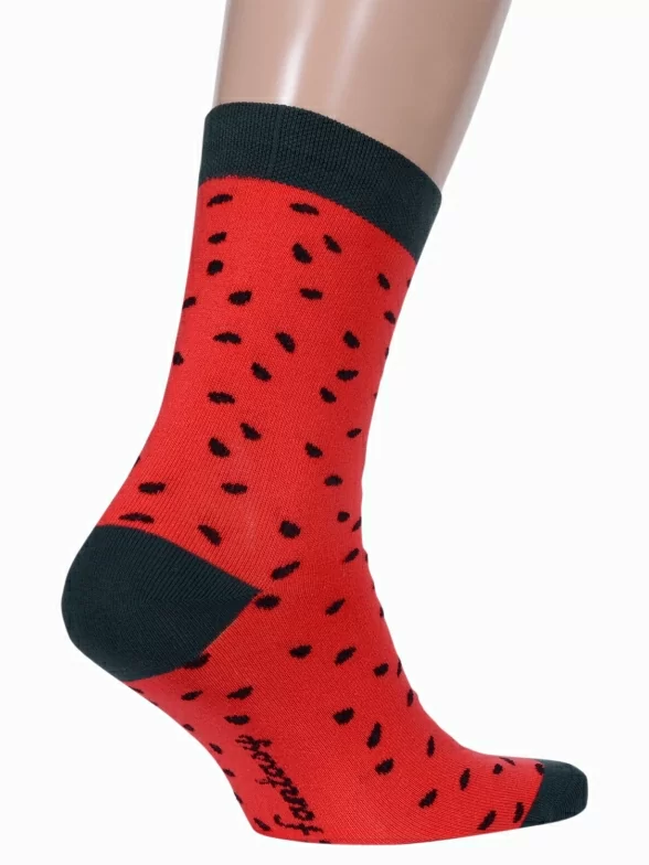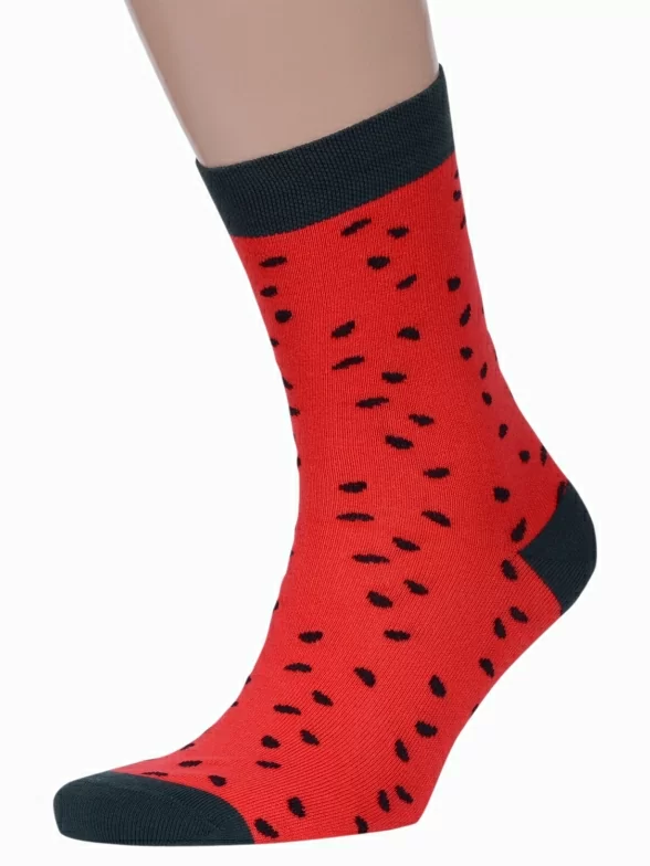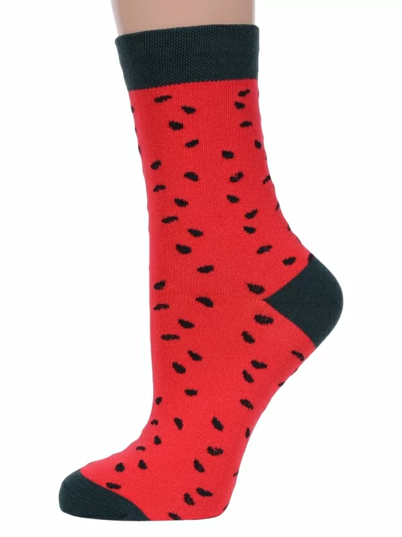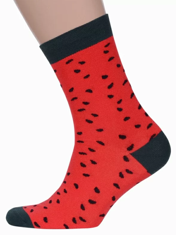 Оригинальные бесшовные носки с необычным принтом в виде среза арбуза. Модель классической длины, Мысок, пятка и манжеты носков выполнены в контрастной однотонной расцветке.