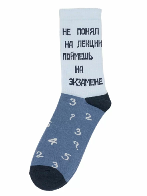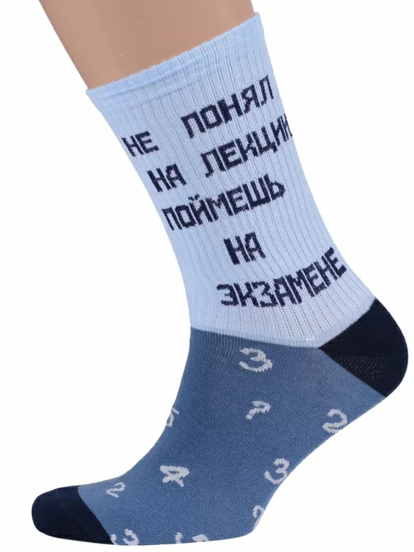 Круглогодичные средней длины носки унисекс, цвет синий-многоцветные (мультиколор), повседневные, шов обычный (не бесшовные), принт (рисунок): учеба, надписи, крупные контрастные рисунки, с узором, в рубчик, состав: 82% хлопок, 15% полиамид, 3% эластан, арт. Nm-117. Производитель «ИП Рыбалкин В.С., Московская область, г. Щелково» под брендом «Msclub».