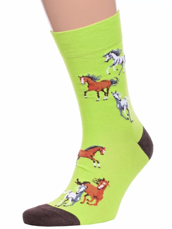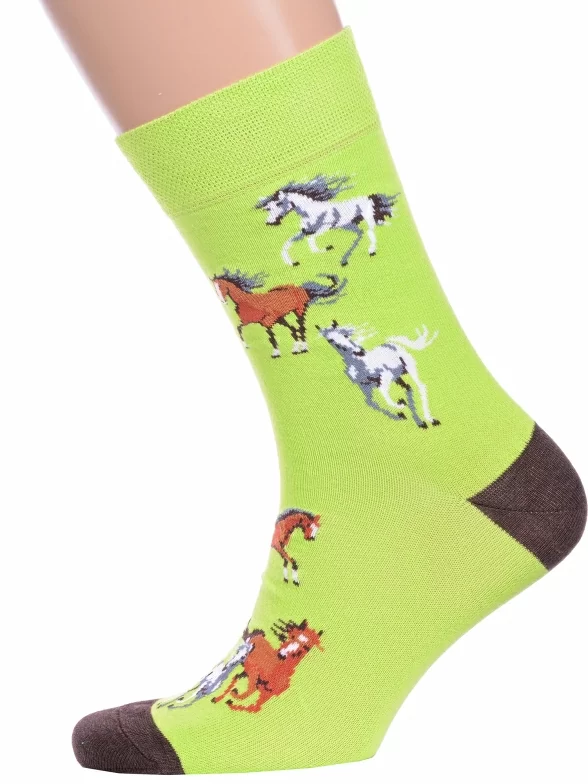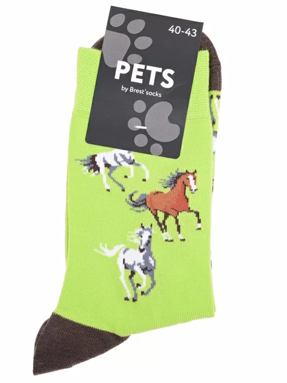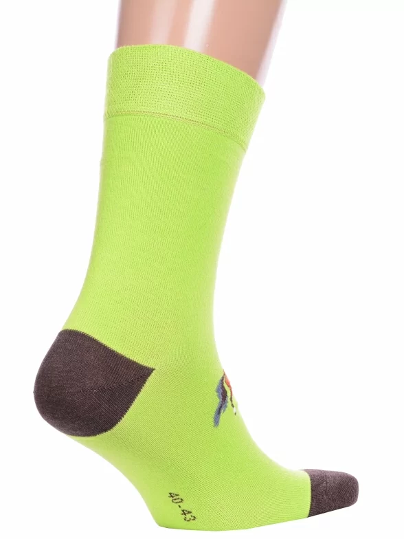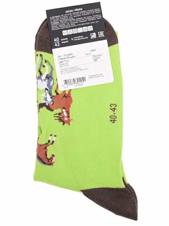 Круглогодичные средней длины носки унисекс, цвет зеленый, повседневные, возможно бесшовные, принт (рисунок): с узором, контрастные пятка / мысок / резинка, животные, состав: 70% хлопок, 28% полиамид, 2% эластан, арт. 21С4200. Производитель «Брестский чулочный комбинат ОАО, Беларусь» под брендом «Брестские (бчк)».