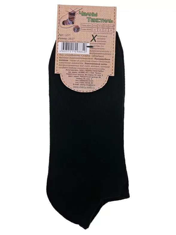 Межсезонные или летние короткие носки унисекс, цвет черный, классические, шов обычный (не бесшовные), принт (рисунок): однотонный, без рисунков/узоров, состав: 80% хлопок, 15% полиамид, 5% эластан, арт. L51. Производитель «ЧЕЛНЫ ТЕКСТИЛЬ» Россия под брендом «Челны текстиль».