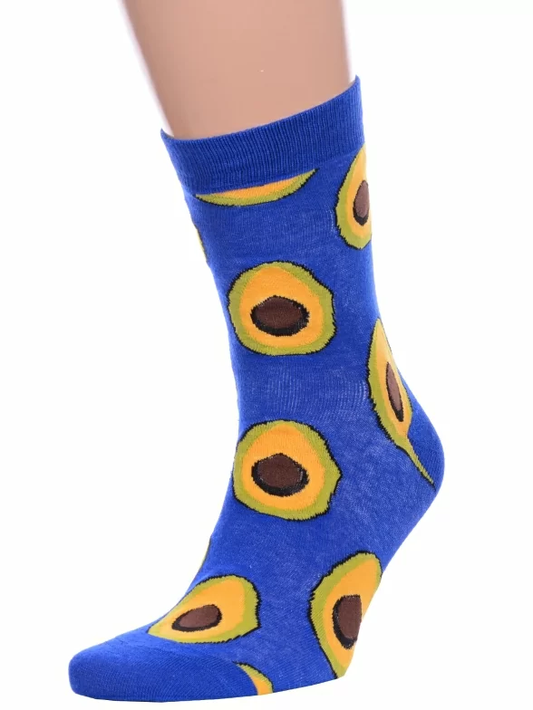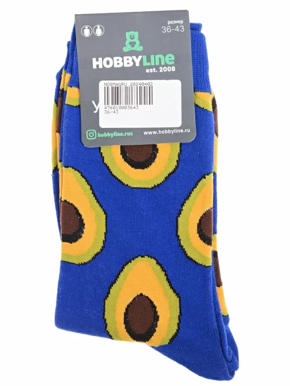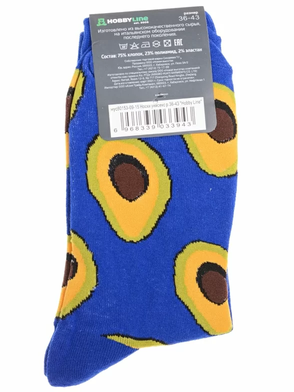Круглогодичные средней длины носки унисекс, цвет синий, повседневные, возможно бесшовные, принт (рисунок): с узором, овощи / фрукты / ягоды, еда и напитки, состав: 75% хлопок, 23% полиамид, 2% эластан, арт. Нус80153-09-15. Производитель «Китай, страна бренда - Россия» под брендом «Hobby line».