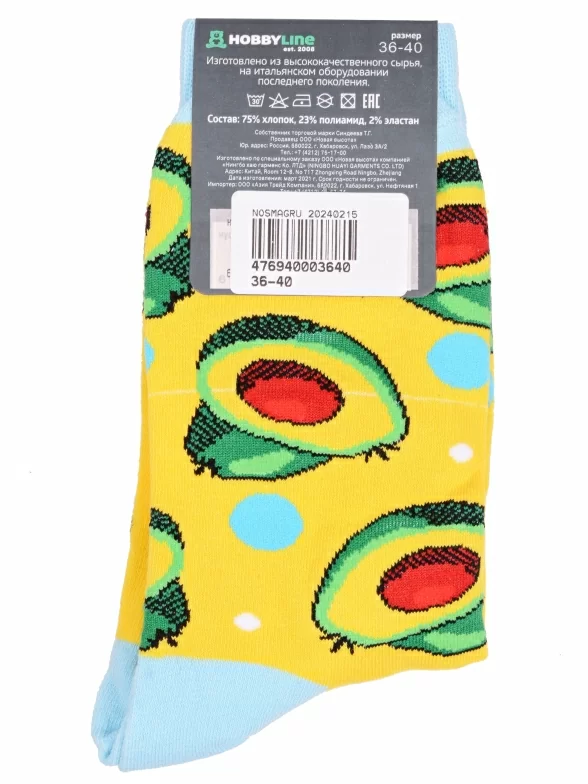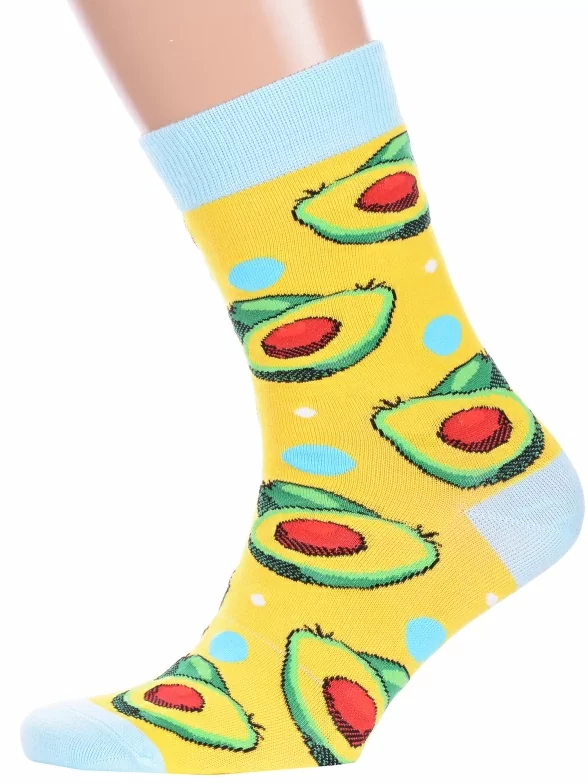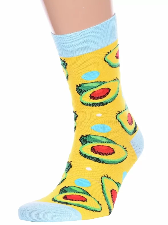 Круглогодичные средней длины носки унисекс, цвет желтый, повседневные, возможно бесшовные, принт (рисунок): с узором, овощи / фрукты / ягоды, контрастные пятка / мысок / резинка, горох / точка, состав: 75% хлопок, 23% полиамид, 2% эластан, арт. Нус80153-09-03. Производитель «Китай, страна бренда - Россия» под брендом «Hobby line».