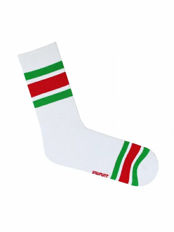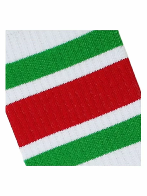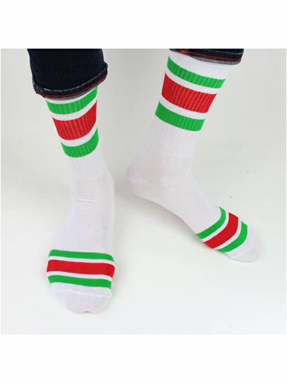 Спорт, как ни странно, совсем не демократичный вид спорта со своим дресс кодом. И обязательным атрибутом многих спортивных костюмов являются белые носки. Мы против правил, и готовы добавить яркие цвета в серую повседневность. Носки, украшенные яркими зелеными и красными полосками, сделаны из качественного хлопка.