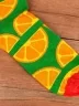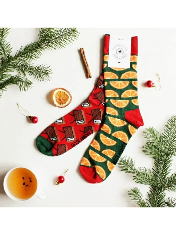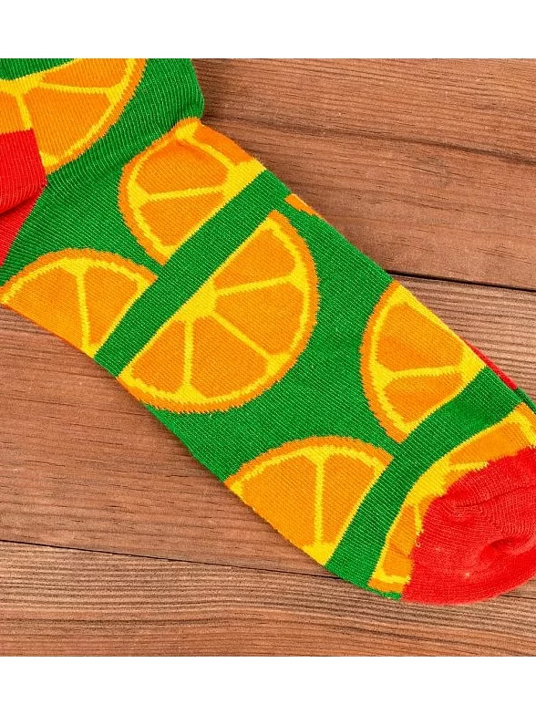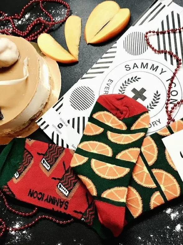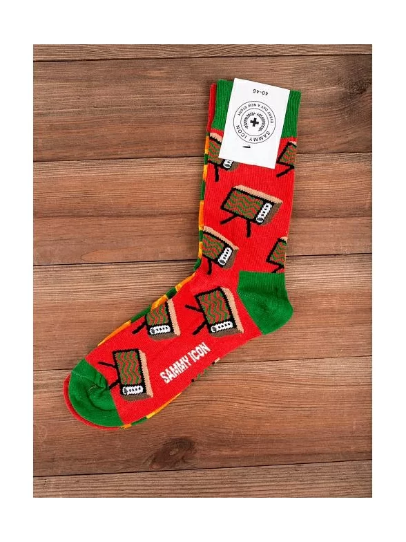 Носки украшены рисунком в виде телевизоров и долек мандарина, причем каждый вид принта распложен на отдельном носке. Модель от Sammy Icon связана из пряжи основе индийского хлопка. Пятка, мысок и широкая резинка сделаны из нитей контрастного цвета.