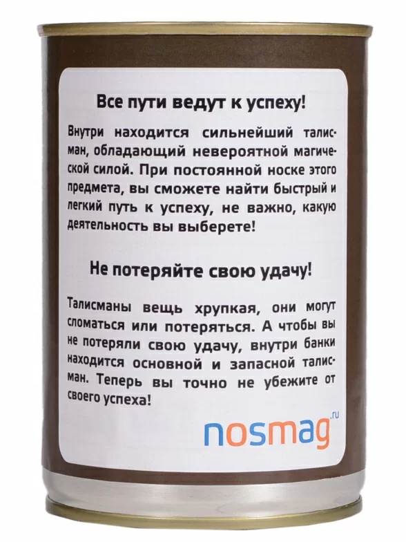 Оригинальный подарок - носки в металлической банке с надписью. Они интересны не только формой, но и содержанием. Мало того, что внутри находится не просто пара, а три носка, один из которых - запасной, на два "основных" нанесены надписи, которые превращают обычные носки в талисман, притягивающий успех и удачу.