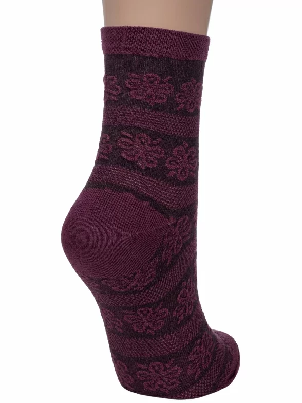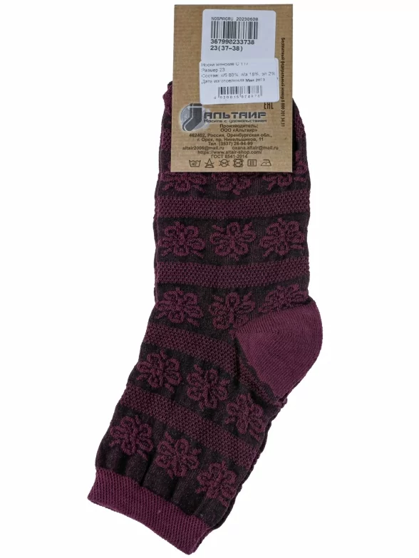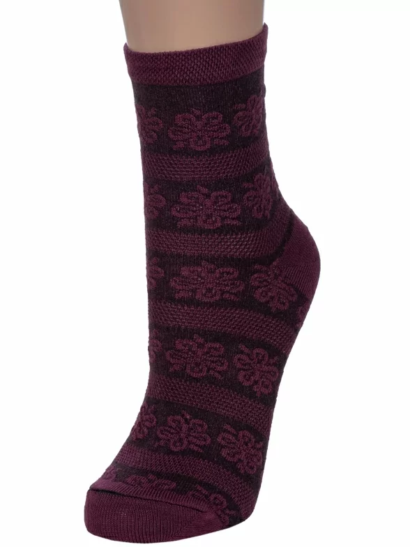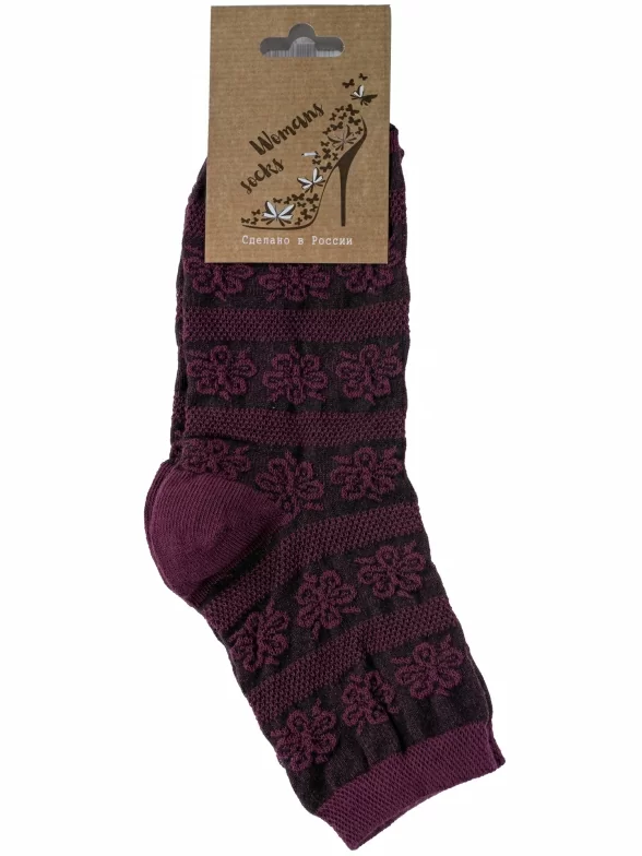Круглогодичные или летние укороченные женские носки, цвет бордовый, в сеточку, повседневные, шов обычный (не бесшовные), принт (рисунок): цветы / растения, кружево (или имитация), с узором, состав: 80% хлопок, 18% полиамид, 2% эластан, арт. С117. Производитель «ООО Альтаир, г. Орск, Оренбургская обл, Россия» под брендом «Альтаир».