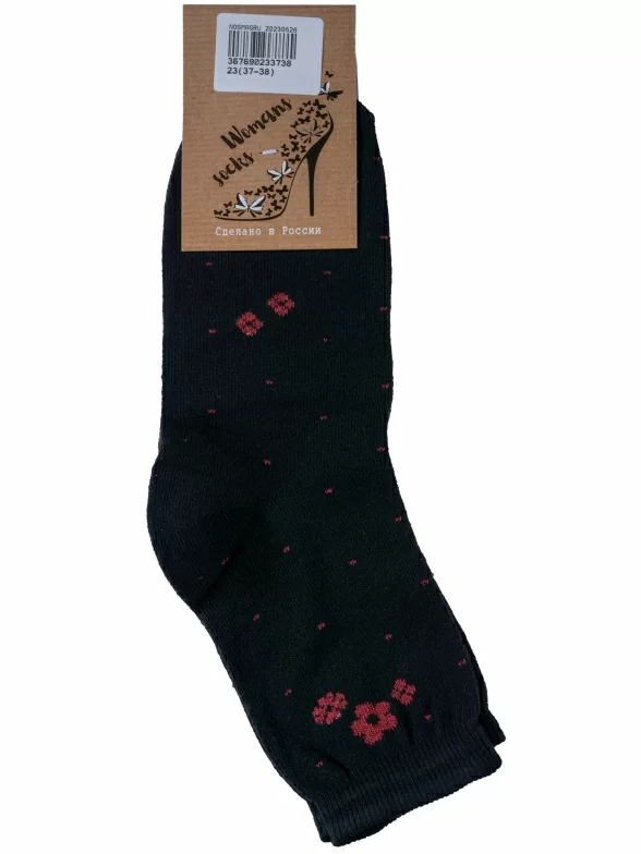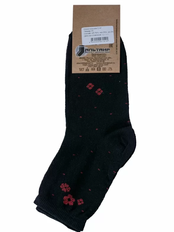Круглогодичные укороченные женские носки, цвет черный, повседневные, шов обычный (не бесшовные), принт (рисунок): цветы / растения, с узором, состав: 75% хлопок, 23% полиамид, 2% эластан, арт. С47. Производитель «ООО Альтаир, г. Орск, Оренбургская обл, Россия» под брендом «Альтаир».