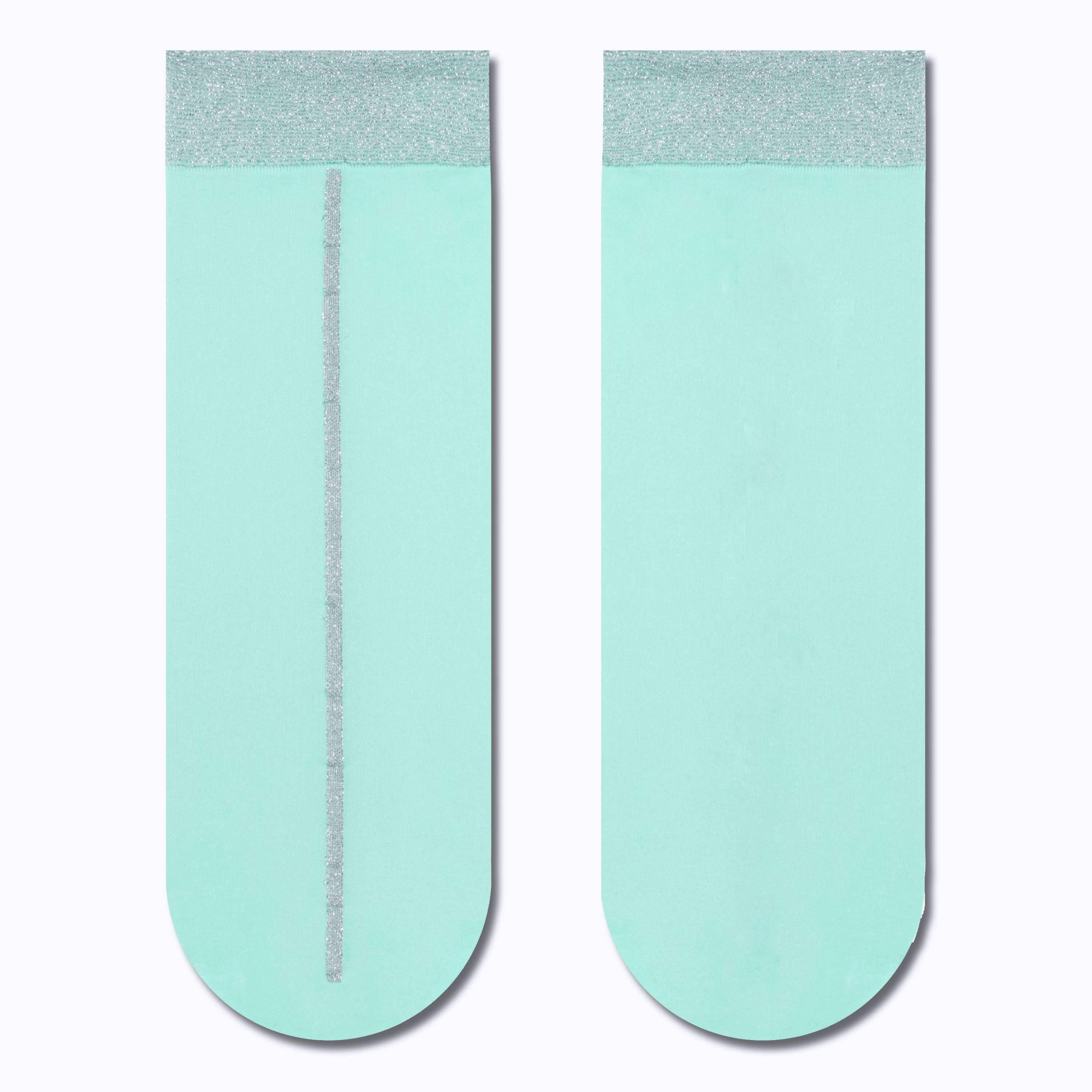 Однотонные капроновые носки с контрастной серебристой люрексовой окантовкой и полоской от резинки через стопу на манер стрелки на чулках.