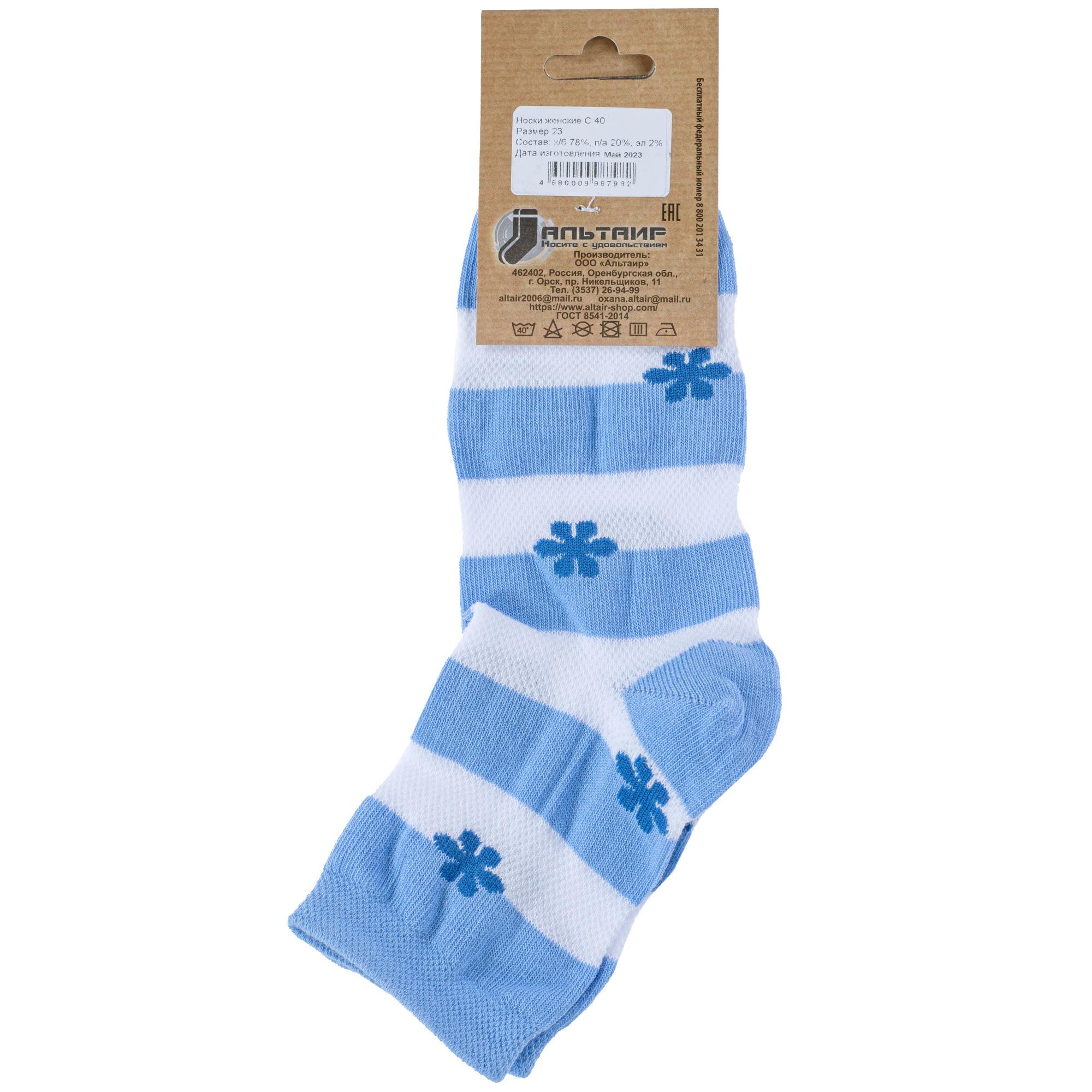 Круглогодичные или летние укороченные женские носки, цвет голубой, в сеточку, повседневные, шов обычный (не бесшовные), принт (рисунок): цветы / растения, с узором, состав: 78% хлопок, 20% полиамид, 2% эластан, арт. С40. Производитель «ООО Альтаир, г. Орск, Оренбургская обл, Россия» под брендом «Альтаир».