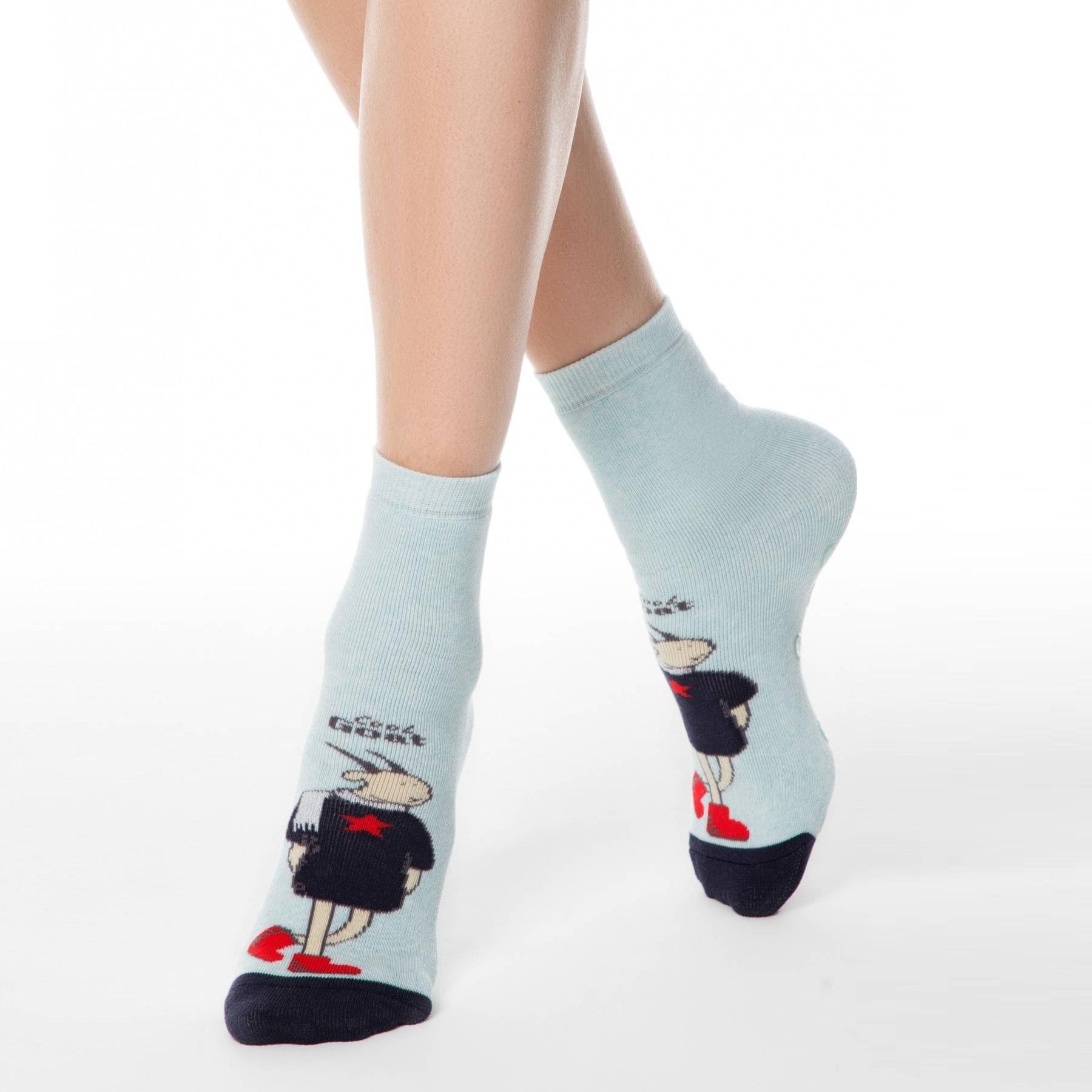 Модель чуть укороченной длины с внутренней махрой без отдельной вывязанной пятки с двойным бортом (манжетом резинки). Из отличительных особенностей носков забавный принт в виде козочки и наличие силиконовых стопперов, благодаря которым ноги в этих носках не будут скользить по гладкому полу.