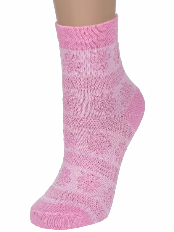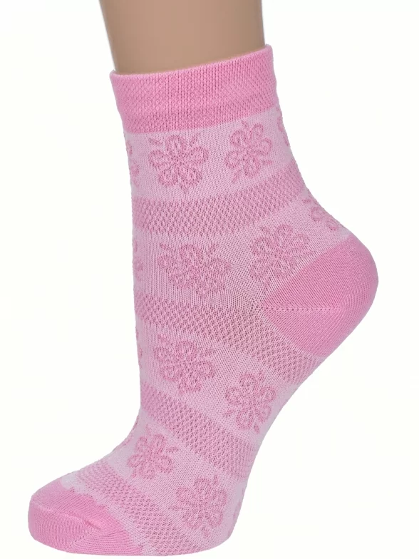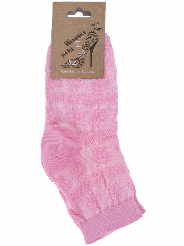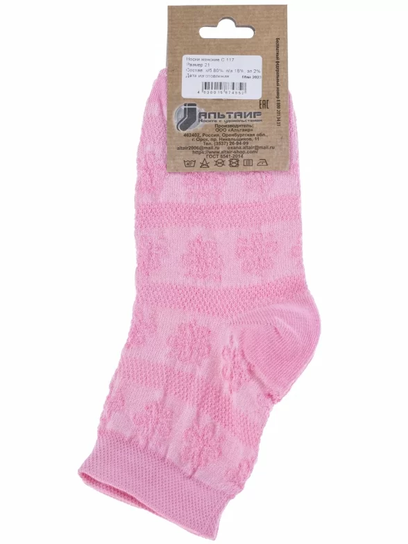 Летние или круглогодичные укороченные женские носки, цвет розовый, повседневные, в сеточку, шов обычный (не бесшовные), принт (рисунок): кружево (или имитация), с узором, цветы / растения, состав: 80% хлопок, 18% полиамид, 2% эластан, арт. С117. Производитель «ООО Альтаир, г. Орск, Оренбургская обл, Россия» под брендом «Альтаир».