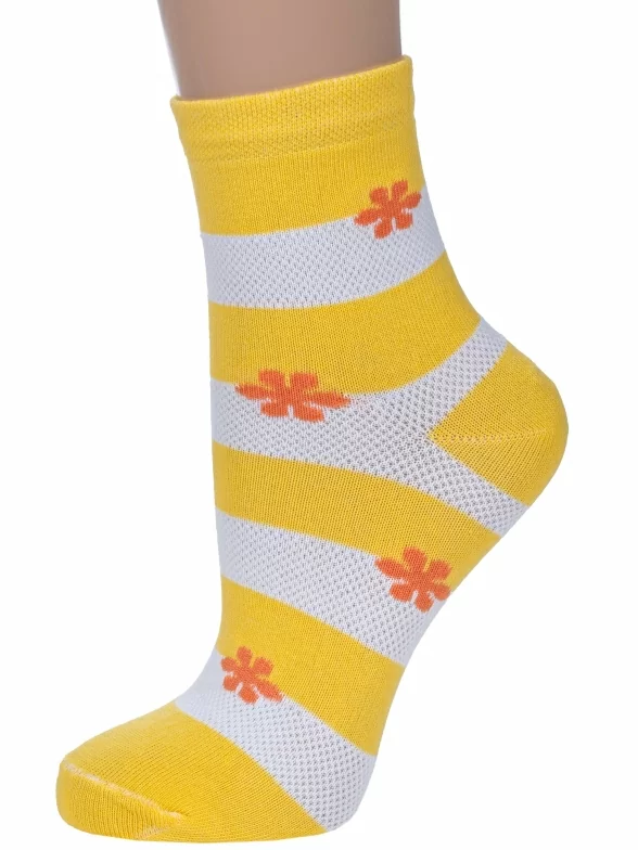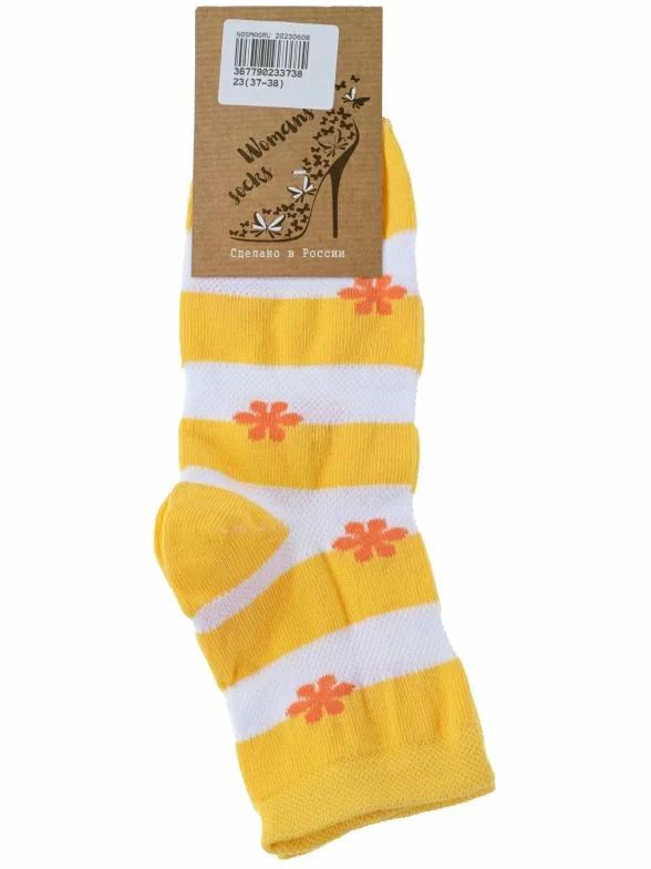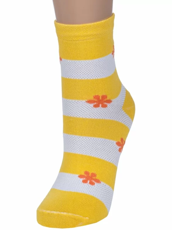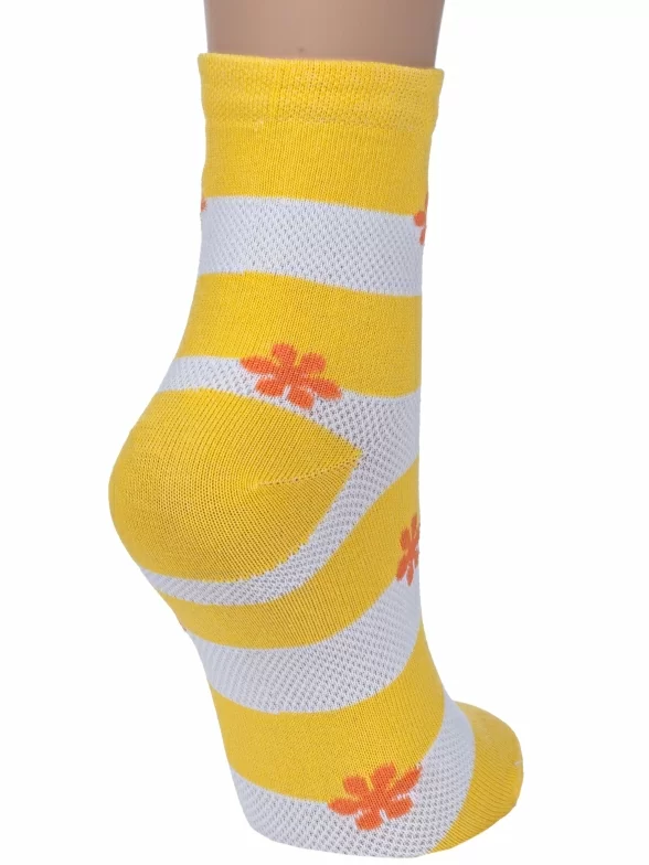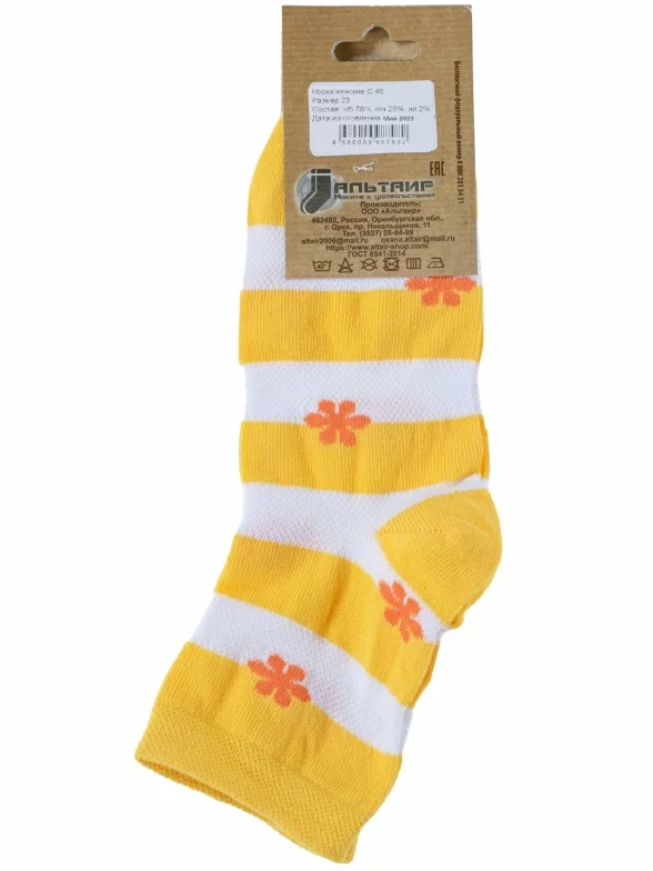 Круглогодичные или летние укороченные женские носки, цвет желтый, в сеточку, повседневные, шов обычный (не бесшовные), принт (рисунок): цветы / растения, с узором, состав: 78% хлопок, 20% полиамид, 2% эластан, арт. С40. Производитель «ООО Альтаир, г. Орск, Оренбургская обл, Россия» под брендом «Альтаир».
