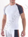 Стильная футболка прилегающего силуэта, выполненная в спортивном стиле. Модель имеет контрастные рукава различающихся цветов, украшенные акцентирующими полосками.