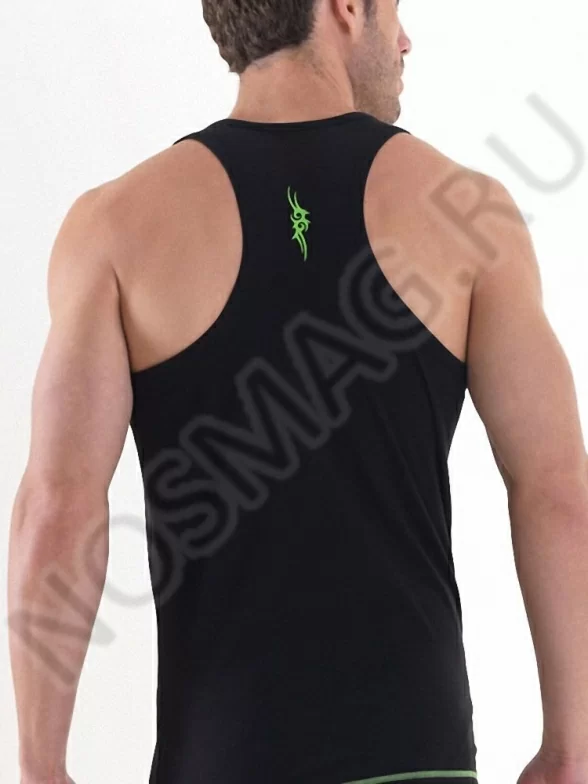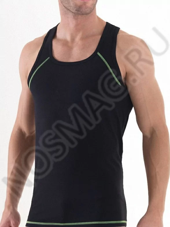 Майка-борцовка, украшенная контрастными строчками. Имеет прилегающий силуэт и слегка расширенные бретели.